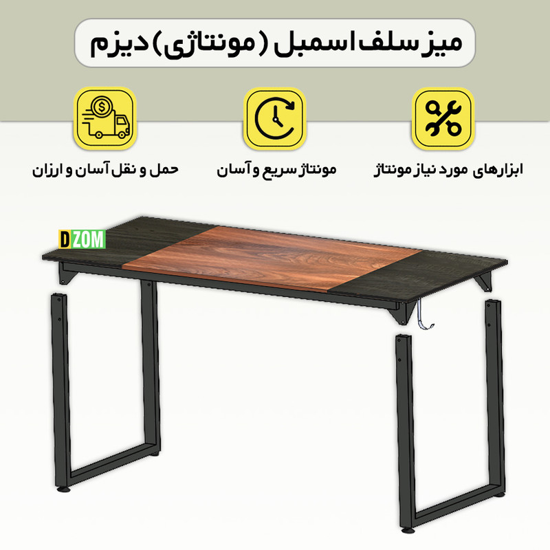 میز اداری DZom مدل مونتاژی TLD_asm_150×90_Tri_BABRN محصولی مونتاژی، سبک، شیک و در عین حال جذاب و کارآمد از سری تولیدات میباشد. این محصول بصورت سلف اسمبل (مونتاژی) تولید شده است. این میز حمل و نقل آسان و هزینه حمل مقرون به صرفه ای دارد. این میز از پایه های فلزی با مقطع 50x30 میلیمتر و رنگ رویه الکترو با ی و دوام بالا ساخته شده است. همچنین پایه های پیچی، قابلیت تنظیم نسبت به سطح زمین را دارد تا بهترین تراز جهت جلوگیری از تکان خوردن را ایجاد نماید. صفحه میز از جنس MDF درجه یک برجسته طرح چوب با ترکیبی از دو رنگ مشکی و قهوهای می باشد. این محصول با طول 150cm، عرض 90cm و ارتفاع 75cm عرضه می شود. به این نکته توجه شود که تنوع رنگ انتخابی کالا تنها مربوط به رنگ پایه های فلزی میباشد.