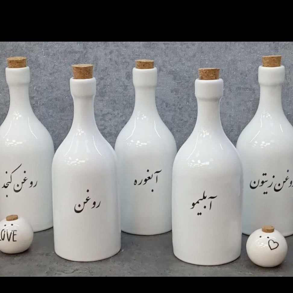 روغن ریز بدون دسته با فونت فارسی گنجایش ۵۰۰ میل روغن مایع جنس سرامیکی درب چوب پنبه کنار گاز قرار میگیره