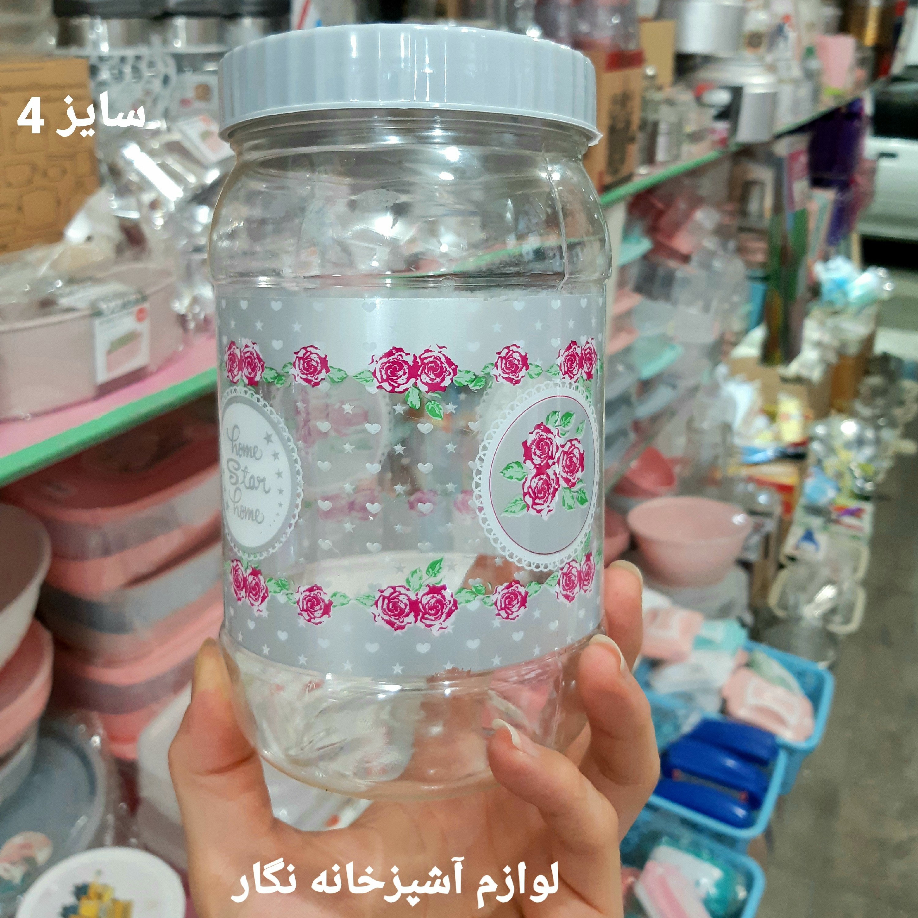 بانکه گلدار سایز ۴ رنگ طوسی مناسب حبوبات قند شکر و چای و... شفاف✅ ساخت از بهترین مواد👌 طراحی زیبا🥰 سایز ارتفاع ۱۹× قطر ۱۰