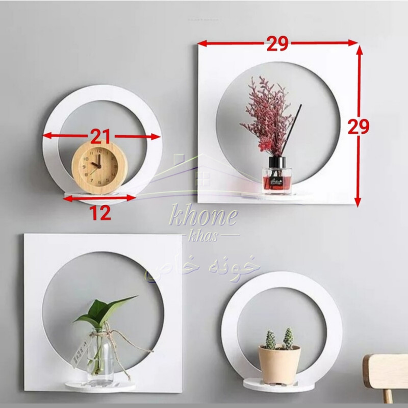 شلف دیواری دایره مربع محصول ی خونه خاص بوده که از جنس پی وی سی درجه یک تولید شده است. این محصول با ظاهری ساده نمایی هندسی بسیار زیبایی دارد .ترکیب 4 عددی این شلف ها در زوایای مختلف در کنار هم جلوه های متفاوتی به منزل یا محل کار شما می دهد. این محصول از جنس پی وی سی با کیفیت تولید شده که مقاومت کامل در برابر آب و رطوبت را دارا است ، بنابراین در صورت نیاز به سادگی می توانید آن را تمیز کنید و یا حتی کاملا بشویید . طراحی ظاهری شلف دو جفت دایره و مربع زیبا می باشد که بر روی قسمت پایینی خود یک کفی جهت قرار دادن لوازم تزیینی کوچک دارد . رنگ سفید این محصول جنس پی وی سی و قابل شستشو است و سایر رنگها (نسکافه ای، قهوه ای و ...) از جنس mdf بوده، قابل شستشو نمی باشد ولی با توجه به رنگ دکور شما می تواند زیبا و در خور توجه باشد. محصول اصلی با ابعاد اصلی و کیفیت عالی فقط با برند و بسته بندی خونه خاص ال می شود.