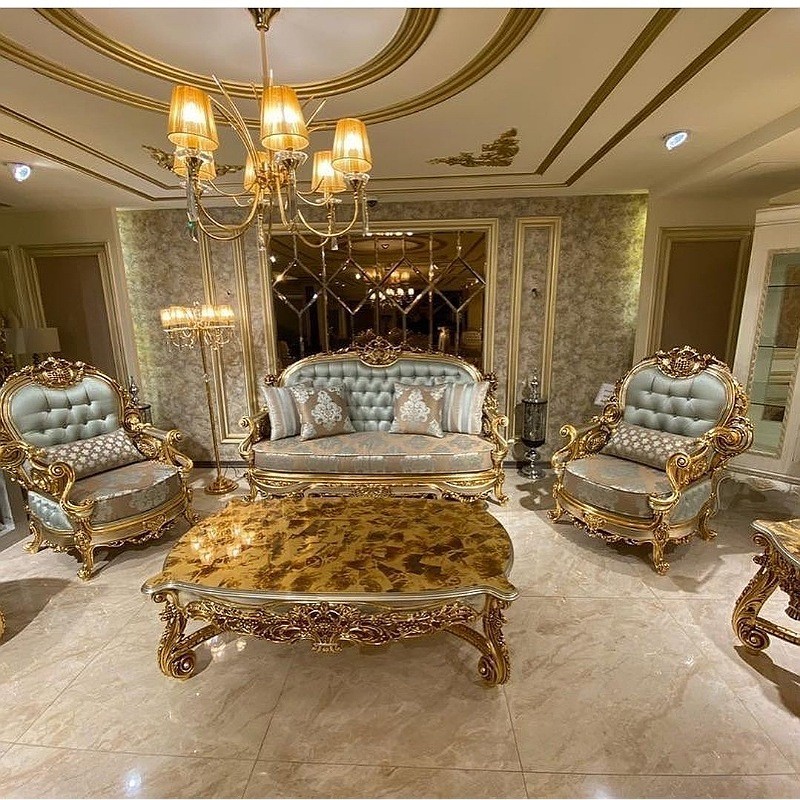 ارسال با باربری مبل سلطنتی استیل فوقالعاده لوکس و شکیل مدل زئوس نشیمن نه نفره باجلومبلی عسلی کلاف اصلی ملایر جنس چوب فقط راش گرجستان رنگ اکلیل المانی درجه یک به همراه ورق طلا پارچه شنل ایتالیایی اصل تودوزی های داخل و بیرون تماما ازاسفنج 30کیلویی یورتان فوم سرد13سانت شرکتی فنرپاکتی وتسمه کشی شده