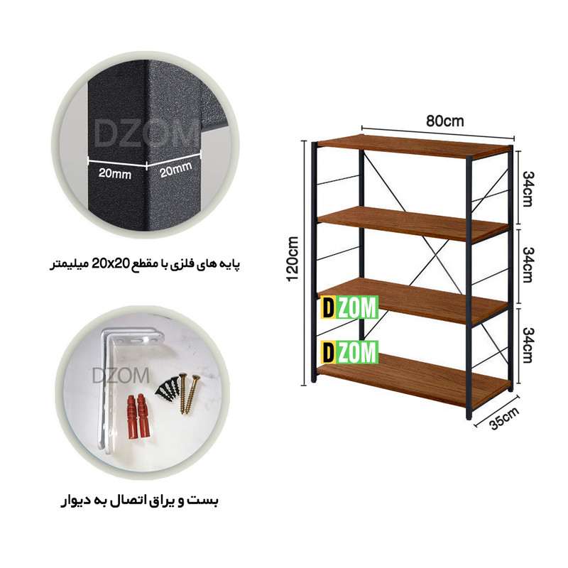 شلف دیزم DZom مدل SLF-34J01-80BRN محصولی سبک، شیک و در عین حال جذاب و کارآمد از سری تولیدات دیزم میباشد. این محصول از پایه های فلزی با مقطع 20x20 میلیمتر و رنگ رویه الکترواستاتیک با ماندگاری و دوام بالا ساخته شده است. همچنین پایه های پیچی، قابلیت تنظیم نسبت به سطح زمین را دارد تا بهترین تراز جهت جلوگیری از تکان خوردن را ایجاد نماید. صفحه محصول از جنس MDF درجه یک برجسته طرح چوب و به رنگ قهوه ای می باشد. این محصول با طول 80cm، عرض 35cm و ارتفاع 120cm عرضه می شود. به این نکته توجه شود که تنوع رنگ انتخابی کالا تنها مربوط به رنگ پایه های فلزی میباشد و محصول به صورت کاملا مونتاژ شده و آماده استفاده برای مشتریان ال می گردد. توصیه میشود جهت حفظ ایمنی و ثبات بیشتر، محصول در یک یا دو نقطه به دیوار پیچ گرد.(یراق اتصال داخل بسته بندی موجود است).