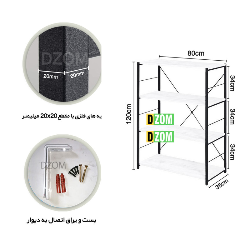 شلف دیزم DZom مدل SLF-34J01-80W محصولی سبک، شیک و در عین حال جذاب و کارآمد از سری تولیدات دیزم میباشد. این محصول از پایه های فلزی با مقطع 20x20 میلیمتر و رنگ رویه الکترواستاتیک با ماندگاری و دوام بالا ساخته شده است. همچنین پایه های پیچی، قابلیت تنظیم نسبت به سطح زمین را دارد تا بهترین تراز جهت جلوگیری از تکان خوردن را ایجاد نماید. صفحه محصول از جنس MDF درجه یک برجسته طرح چوب و به رنگ سفید می باشد. این محصول با طول 80cm، عرض 35cm و ارتفاع 120cm عرضه می شود. به این نکته توجه شود که تنوع رنگ انتخابی کالا تنها مربوط به رنگ پایه های فلزی میباشد و محصول به صورت کاملا مونتاژ شده و آماده استفاده برای مشتریان ال می گردد. توصیه میشود جهت حفظ ایمنی و ثبات بیشتر، محصول در یک یا دو نقطه به دیوار پیچ گرد.(یراق اتصال داخل بسته بندی موجود است).