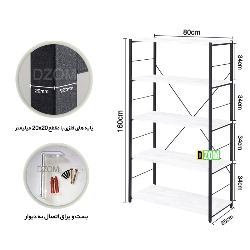 شلف دیزم DZom مدل SLF-88H63-80W محصولی سبک، شیک و در عین حال جذاب و کارآمد از سری تولیدات دیزم میباشد. این محصول از پایه های فلزی با مقطع 20x20 میلیمتر و رنگ رویه الکترواستاتیک با ماندگاری و دوام بالا ساخته شده است. همچنین پایه های پیچی، قابلیت تنظیم نسبت به سطح زمین را دارد تا بهترین تراز جهت جلوگیری از تکان خوردن را ایجاد نماید. صفحه محصول از جنس MDF درجه یک برجسته طرح چوب به رنگ سفید می باشد. این محصول با طول 80cm، عرض 35cm و ارتفاع 160cm عرضه می شود. به این نکته توجه شود که تنوع رنگ انتخابی کالا تنها مربوط به رنگ پایه های فلزی میباشد و محصول به صورت کاملا مونتاژ شده و آماده استفاده برای مشتریان ال می گردد. توصیه میشود جهت حفظ ایمنی و ثبات بیشتر، محصول در یک یا دو نقطه به دیوار پیچ گردد.(یراق اتصال داخل بسته بندی موجود است).