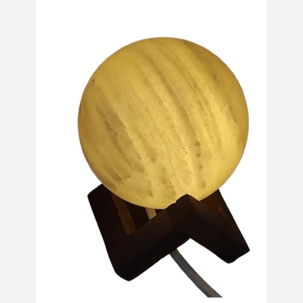 گوی این آباژور ساخته شده از سنگ نمک رگه دار صد در صد طبیعی است. رگه های موجود در سنگ نمک در تصویر در حالت روشن کاملا مشخصه. پایه آباژور چوبی و روشنایی از ال ای دی بسیار کم مصرف تامین میشه . کد محصول d109 پس از سفارش جهت نور ال ای دی که آفتابی یا مهتابی باشد با فروشنده هماهنگ شوید