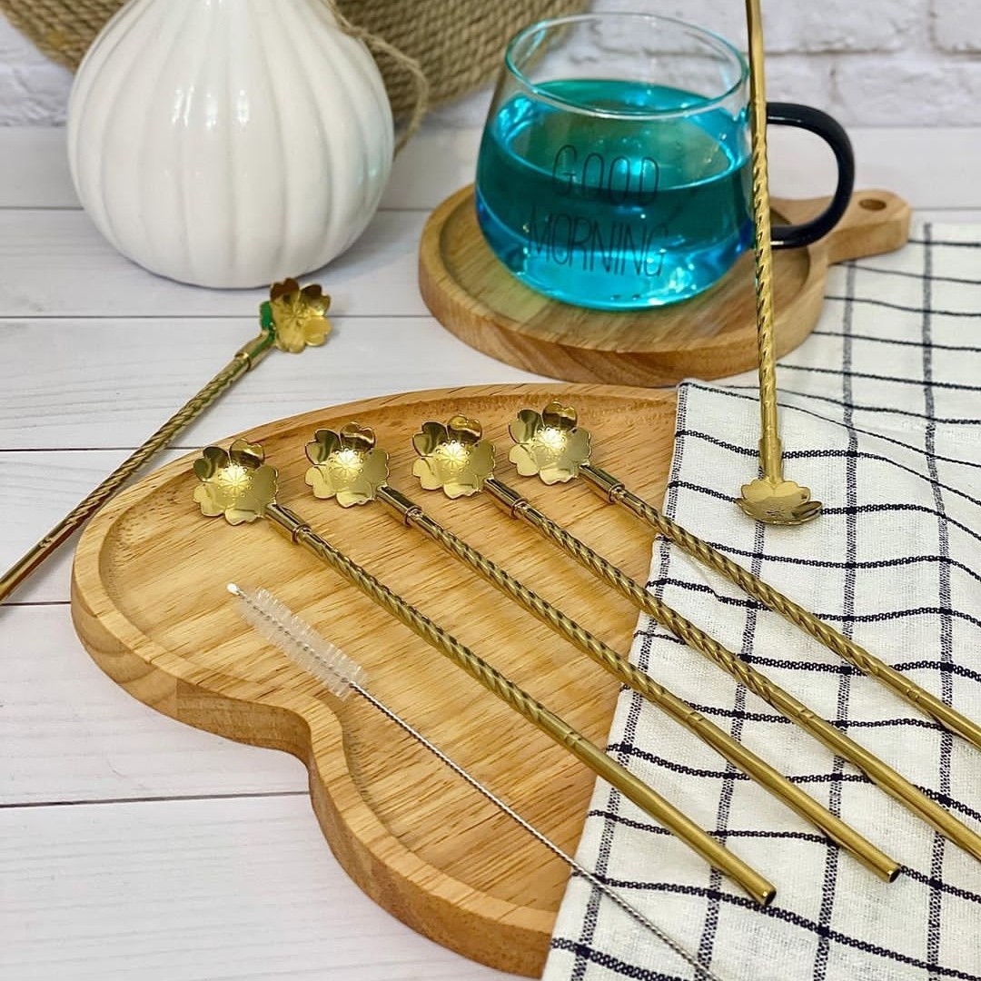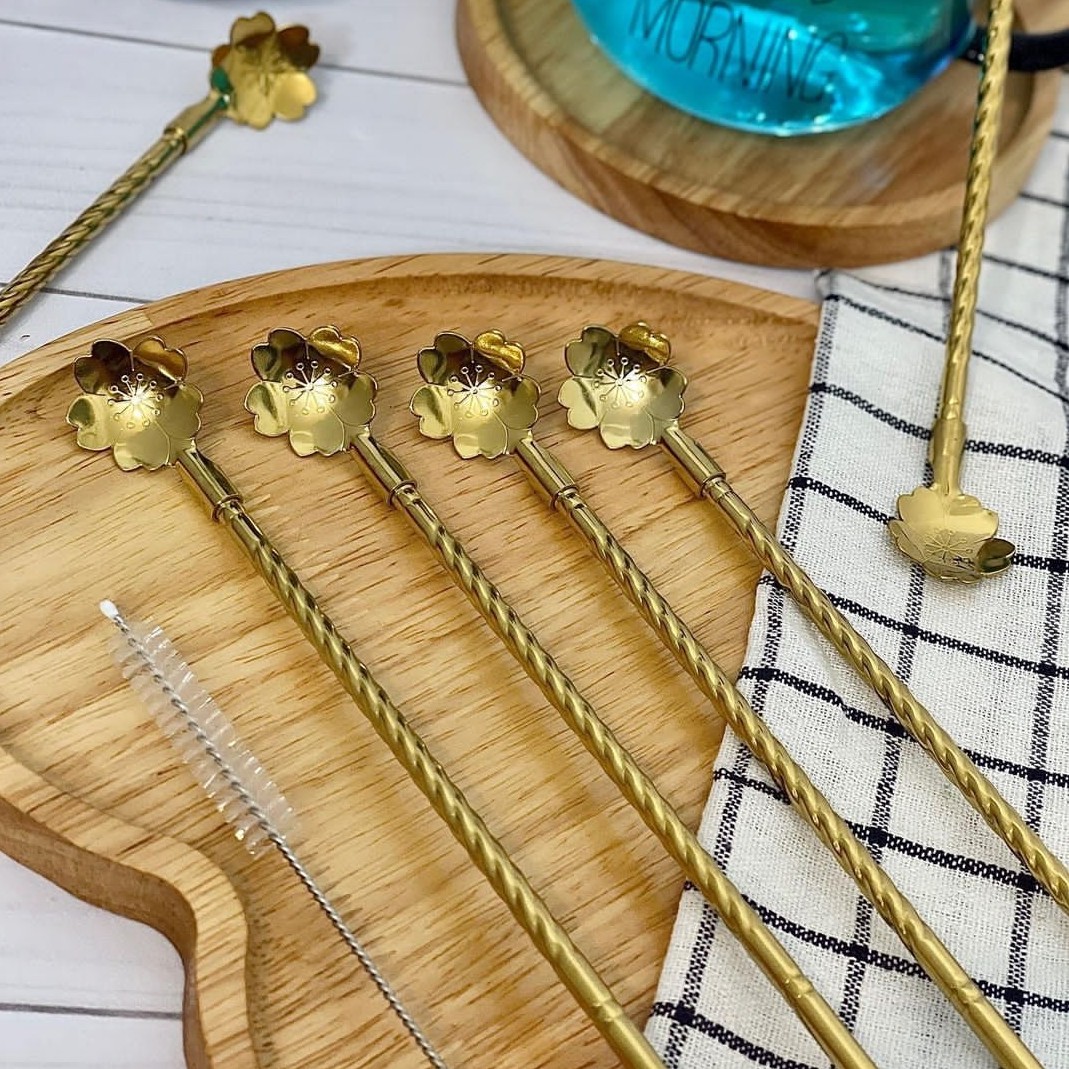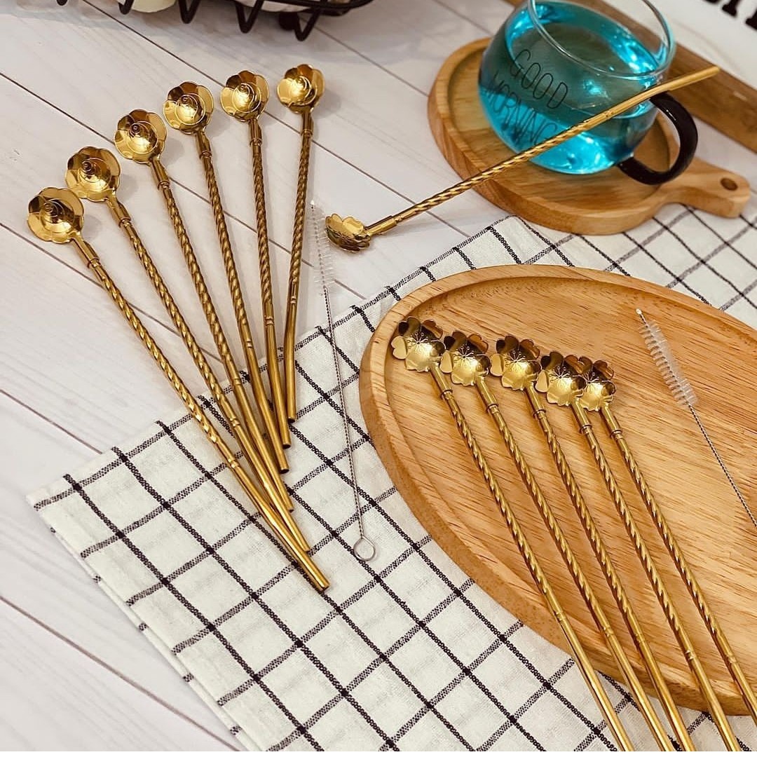 نی شربت استیل قاشق دار طلایی پک ۶تایی همراه بافرچه شستشو برند یونیک لایف