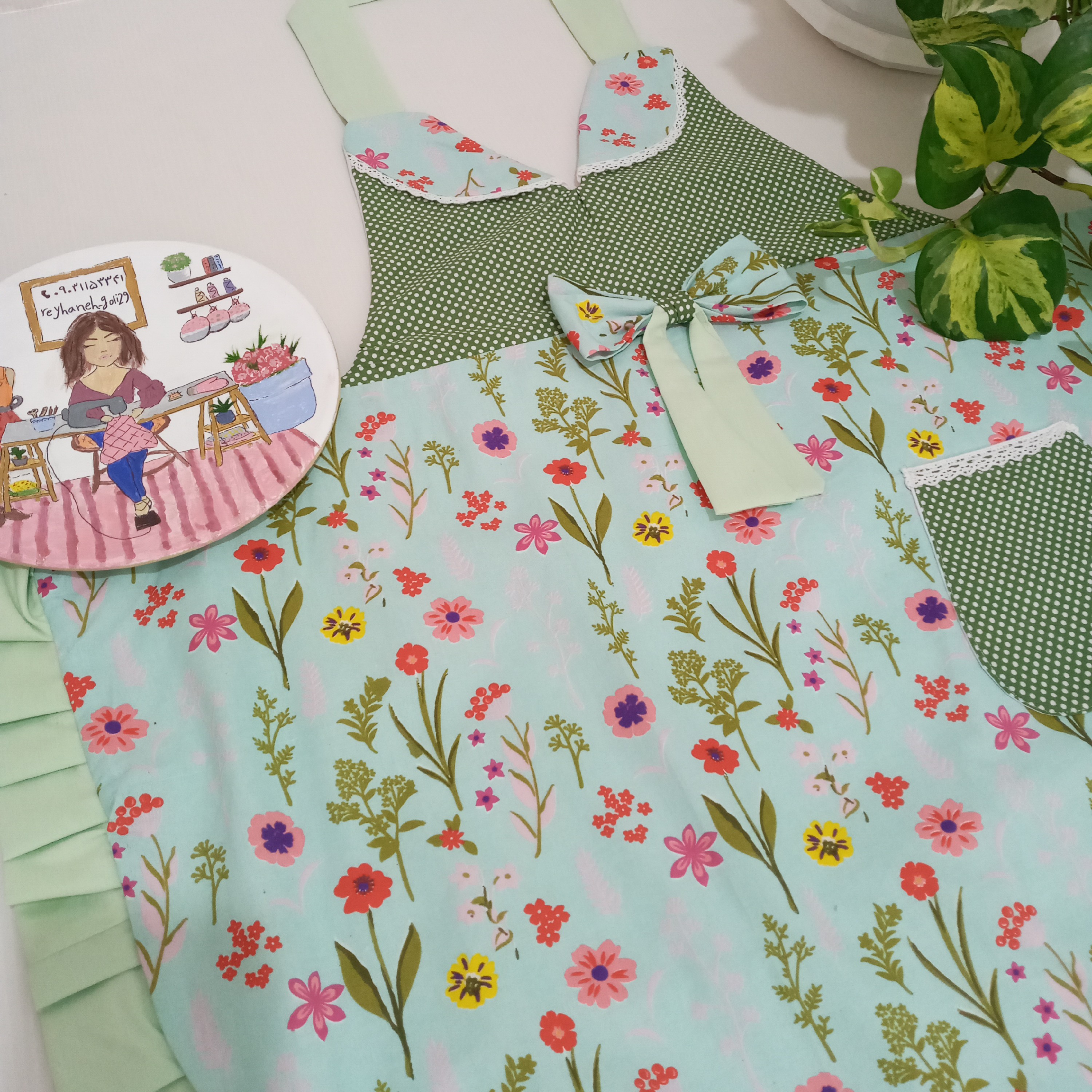پیشبند یقه دار فانتزی جیب دار ۳لایه ضد آب ، پارچه اصلی کتان نخ ، زیر کار پارچه تترون ، ما بین کار از مشما ضخیم دوخت شده که آب را عبور نمیدهد و مشما پاره نمیشود.