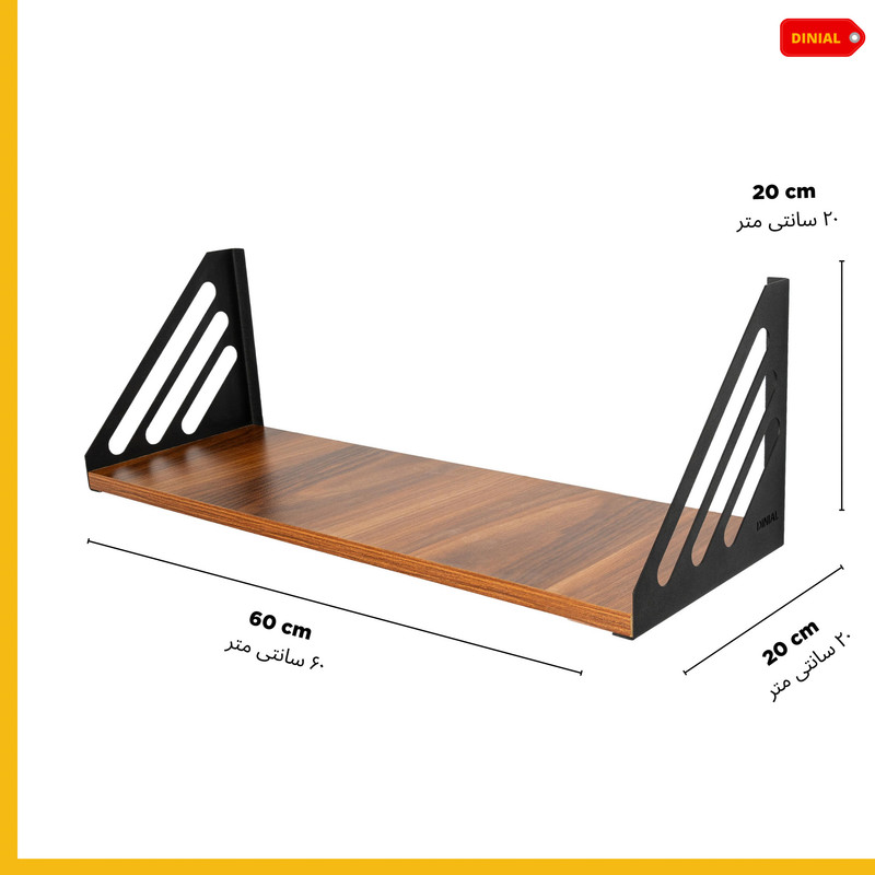 شلف دیواری دینیال مدل خطی , طراحی خاص و کاربردی از برند دینیال قابلیت استفاده در هر محیطی برای نگهداری از کتاب , گلدان , اکسسوری خانه و آشپزخانه و ... ساخته شده از چوب و فلز , چوب ام دی اف با مغز و روکش خارجی , پایه فلزی با رنگ کوره ای ضد زنگ و ضد خش , ابعاد این محصول 20*60 است و اقلام نصب همراه محصول ال می گردد و نصب بسیار انی دارد.