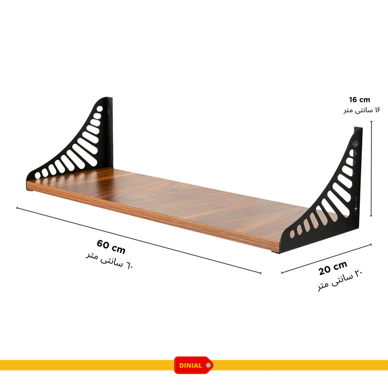شلف دیواری دینیال مدل , طراحی خاص و کاربردی از برند دینیال قابلیت استفاده در هر محیطی برای نگهداری از کتاب , گلدان , اکسسوری خانه و آشپزخانه و ... ساخته شده از چوب و فلز , چوب ام دی اف با مغز و روکش خارجی , پایه فلزی با رنگ کوره ای ضد زنگ و ضد خش , ابعاد این محصول 20*60 است و اقلام نصب همراه محصول ال می گردد و نصب بسیار انی دارد.
