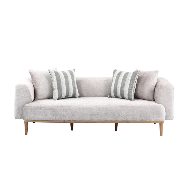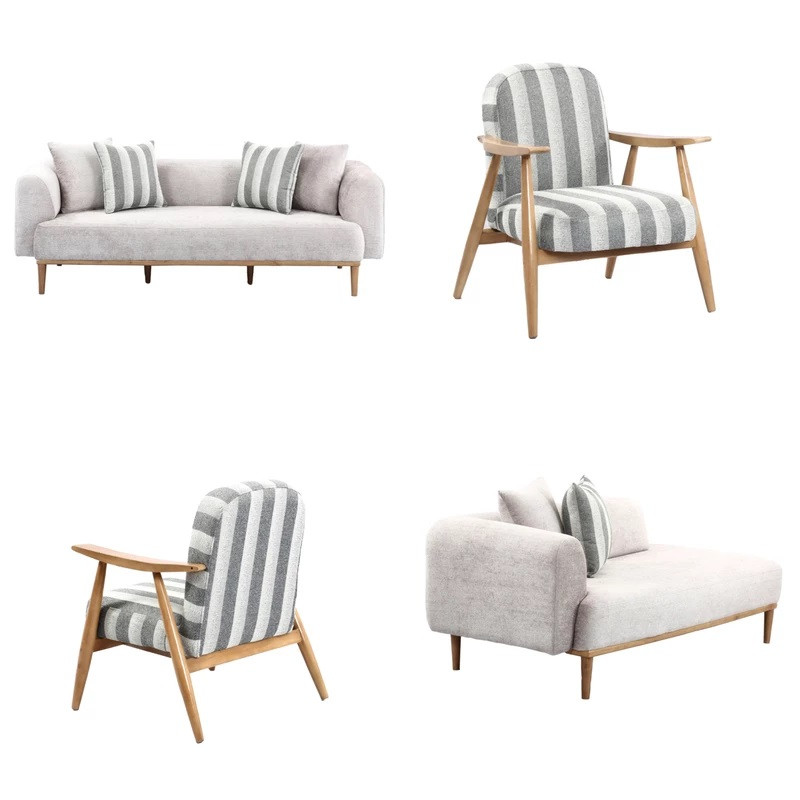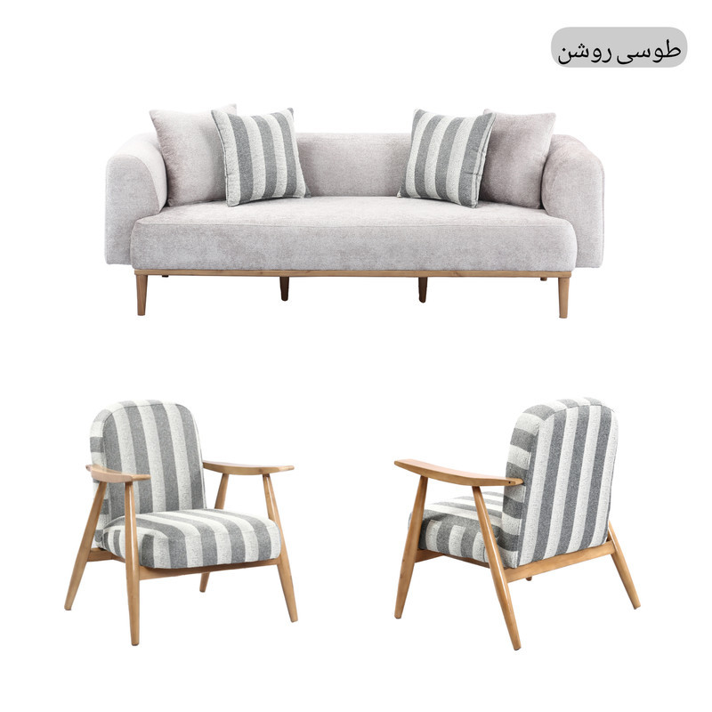 ست هشت نفره ی مدرن شامل یک کاناپه سه نفره و یک شزلون3 نفره،و نیز دو مبل تک نفره چوبی با جدید ترین طراحی و با استفاده از بهترین متریال مصرفی ارائه می شود.کلاف استفاده شده در ساخت این محصول تماما چوب مرغوب و مستحکم روس می باشد.در پایه های این محصول از چوب خودرنگروس استفاده شده که علاوه بر نمای چوبی زیبا دوام بالایی نیز دارد.اسفنج مصرفی در قسمت نشیمن محصول اسفنج 35 کیلویی ویژه که مرغوب ترین نوع اسفنج است استفاده شده که نشیمنی راحت و با دوام را به ارمغان می اورد.پارچه ی انتخاب شده برای این محصول پارچه ی مرغوب بوده که در سبک مدرن کاربرد زیادی دارد که ضمن زیبایی با ویژگی قابلیت شست و شوی انتخابی مناسب محسوب می شود.در مجموع این محصول با نمایی ساده و جذاب,نشیمنی راحت و کیفیتی بالا,انتخابی ایده ال برای دوستداران مبلمان مدرن می باشد