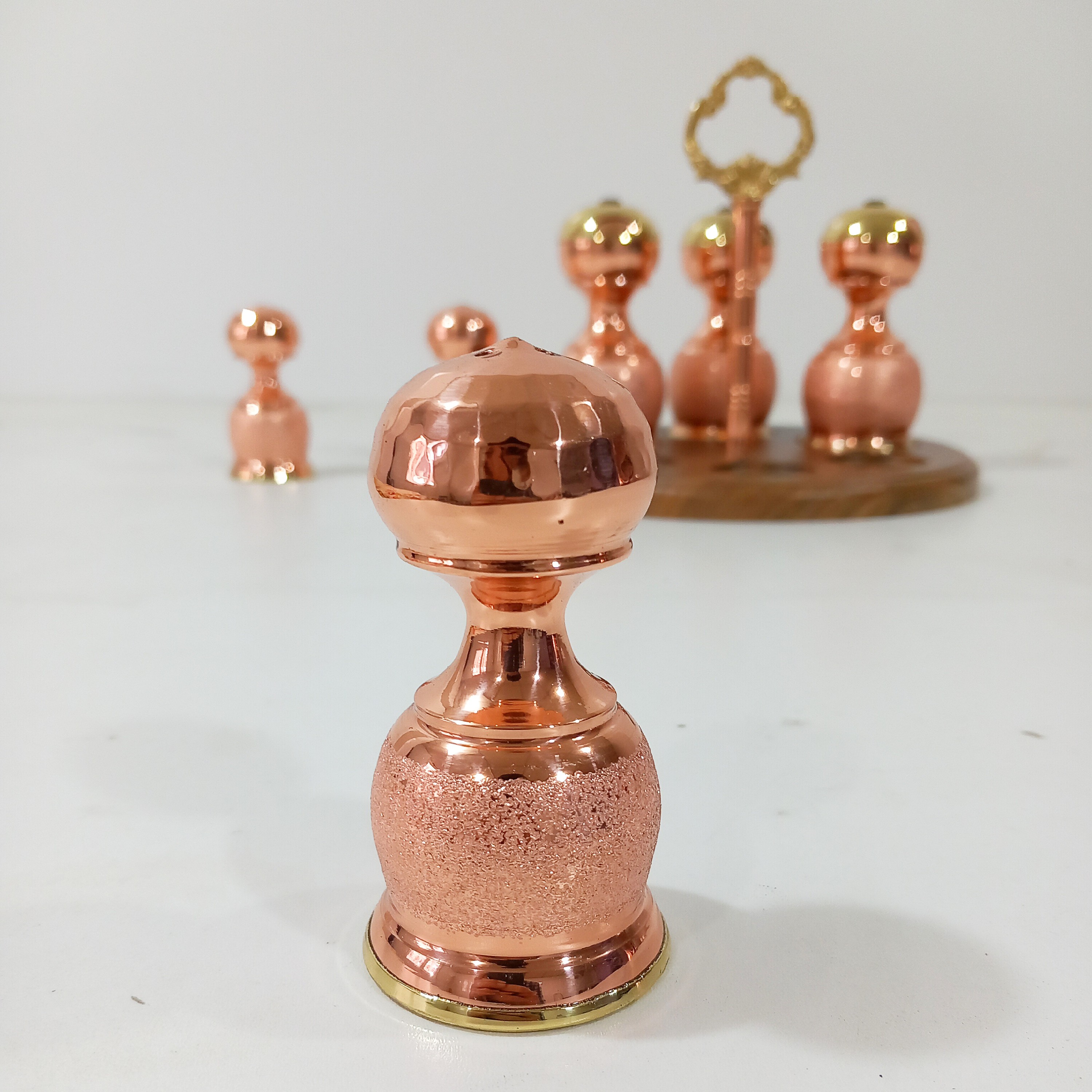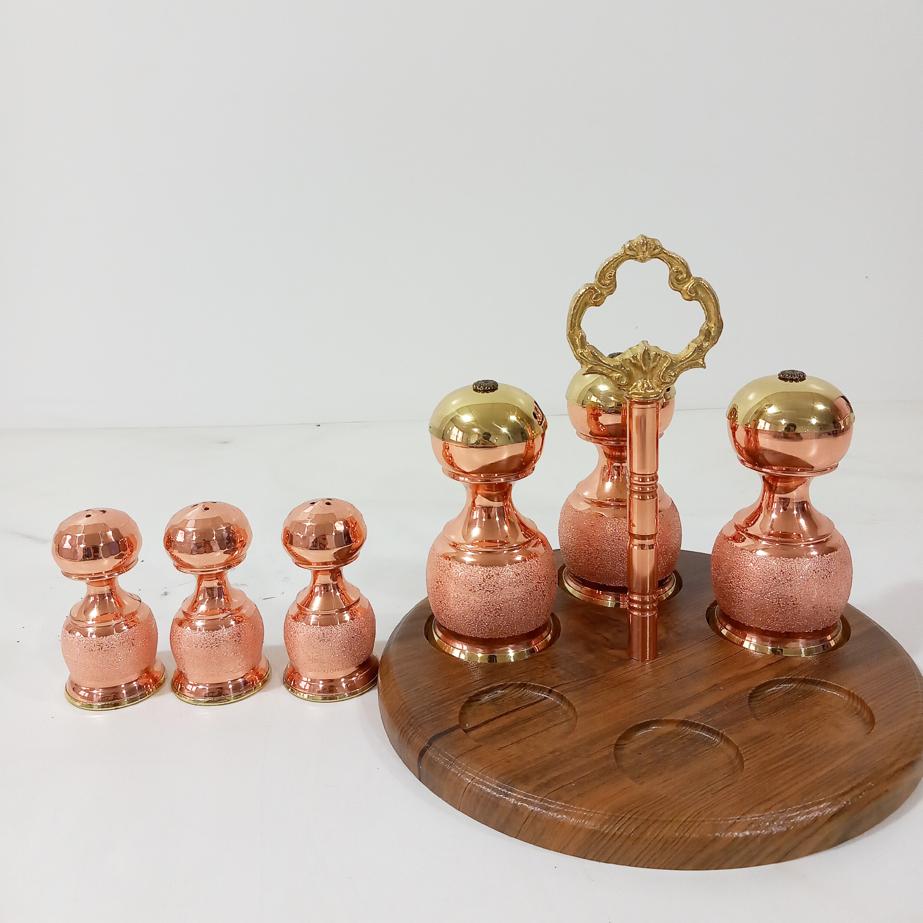 سرویس پاسماوری جا ادویه و نمکدان مسی با استند چوبی مبلمونسرا مدل 290215