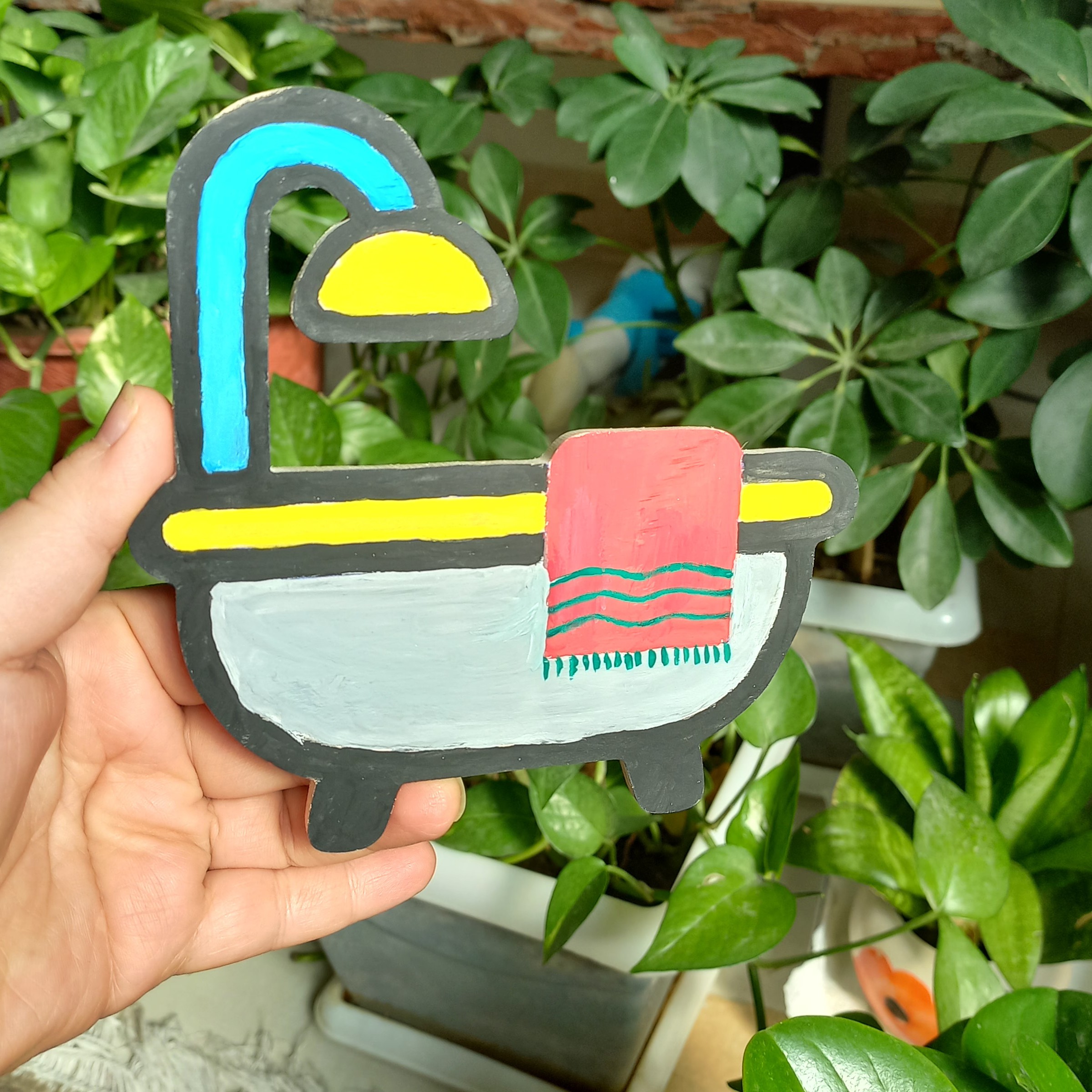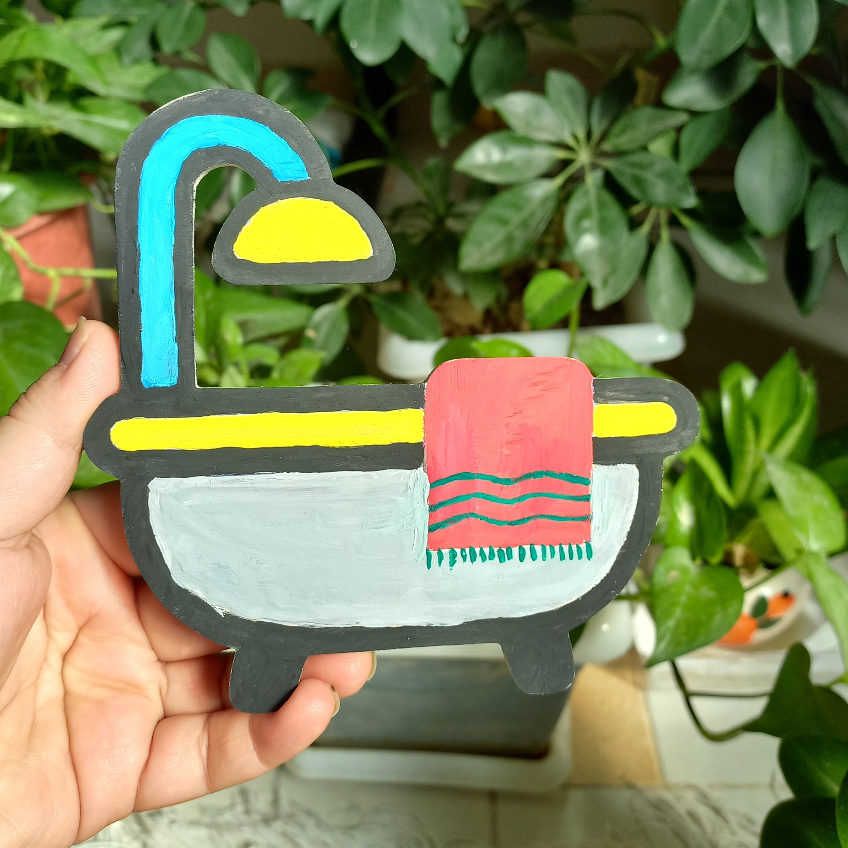 نشانگر درب حمام ساخته شده از تخته سه لایی ..سنباده خورده و طرح و نقش آن به وسیله گواش کشیده شده