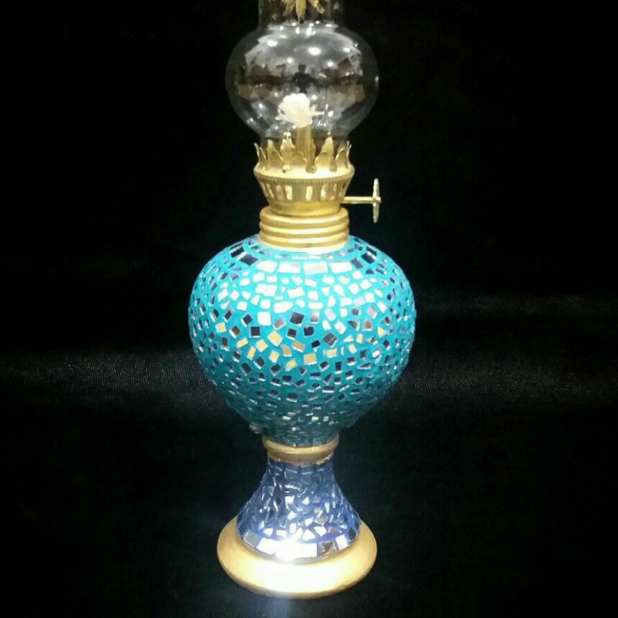آینه کاری شده رنگ فیروزه ای . که قابل روشن شدن هم هست با نفت یا الکل . اما بیشتر برای دکور تزیینی استفاده میکنند.به در خواست مشتری دررنگهای دیگه هم قابل اجرا هست.