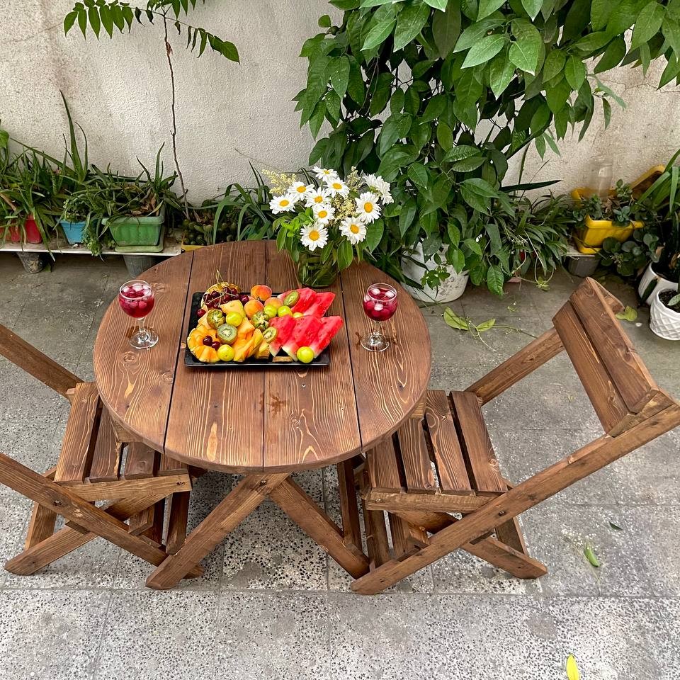 میز و صندلی و نیمکت چوبی تاشو و کمجا ست دو نفره و چهارنفره و.....مناسب برای تراس و کافه و پشت بام و حیاط مبلمونسرا مدل 216926