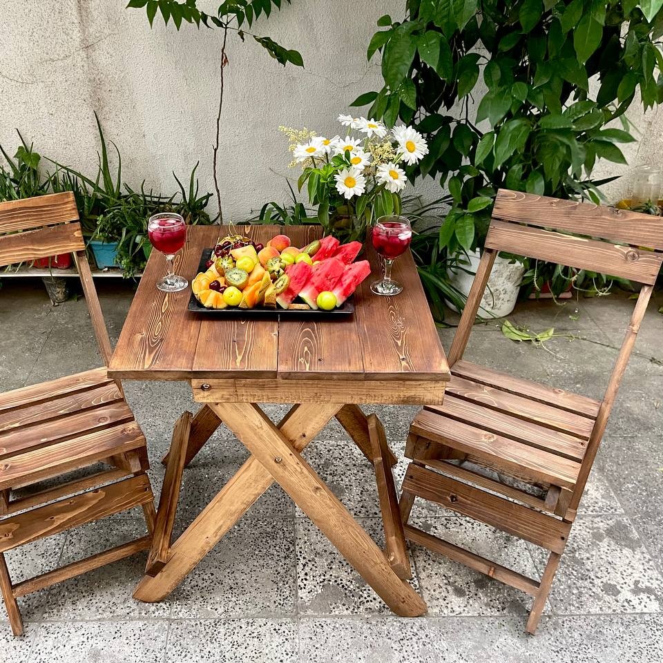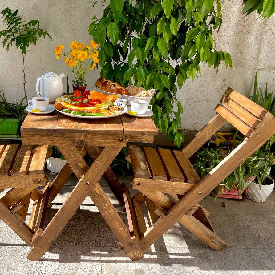 محصولات با کیفیت چوبی تمامی پایه ها ۷ س کارشده چوب نراد روسی ست دو نفره با میز گرد قطر ۷۰ سانت و میز مربع قطر ۶۰ سانت و دو عدد صندلی چوبی تاشو
