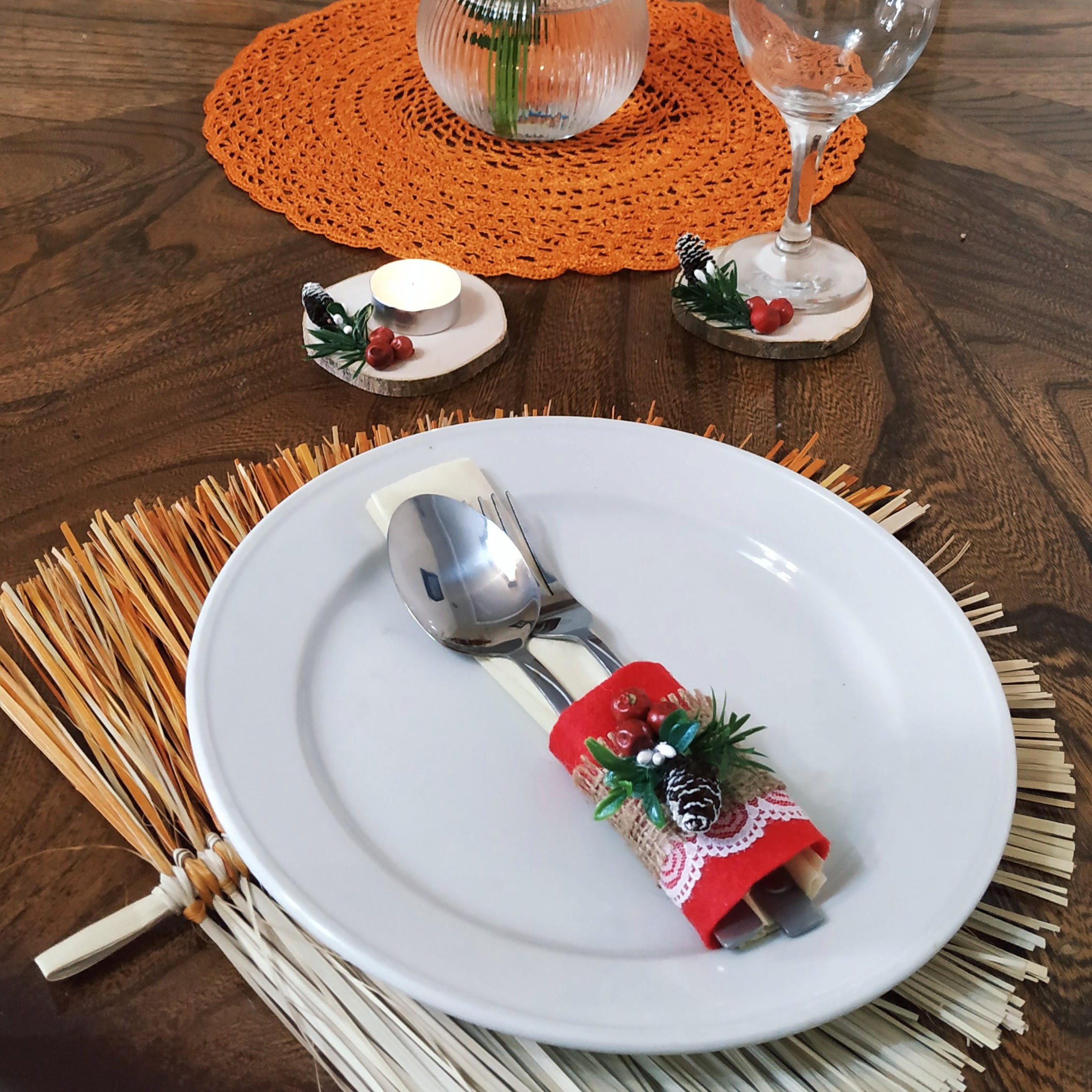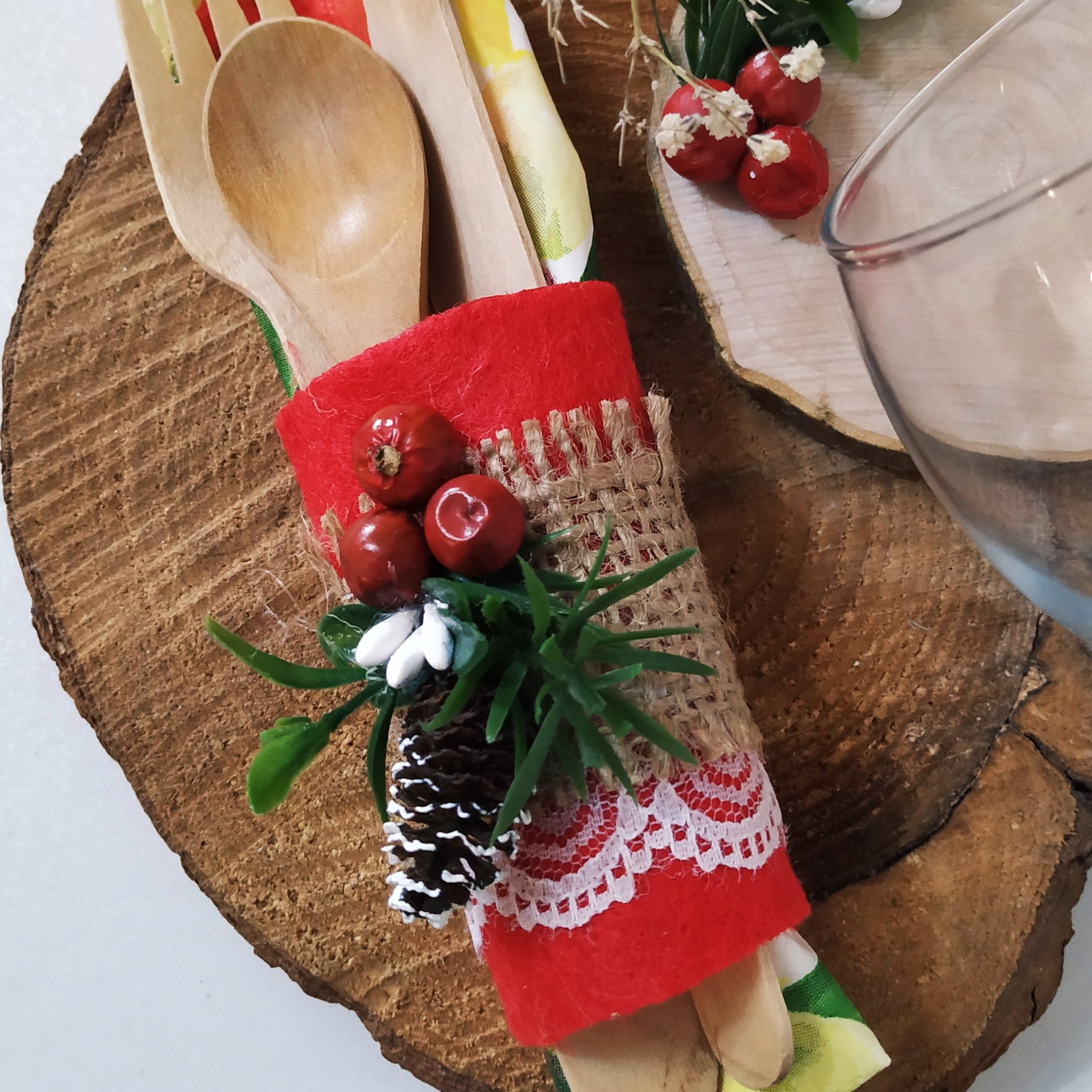حلقه دستمال سفره و زیر لیوانی چوبی...جنس حلقه دستمال از نمد هستش و اندازش طوری طراحی شده که علاوه بر دستمال قاشق و چنگال هم می تونید داخلش بزا رید😉