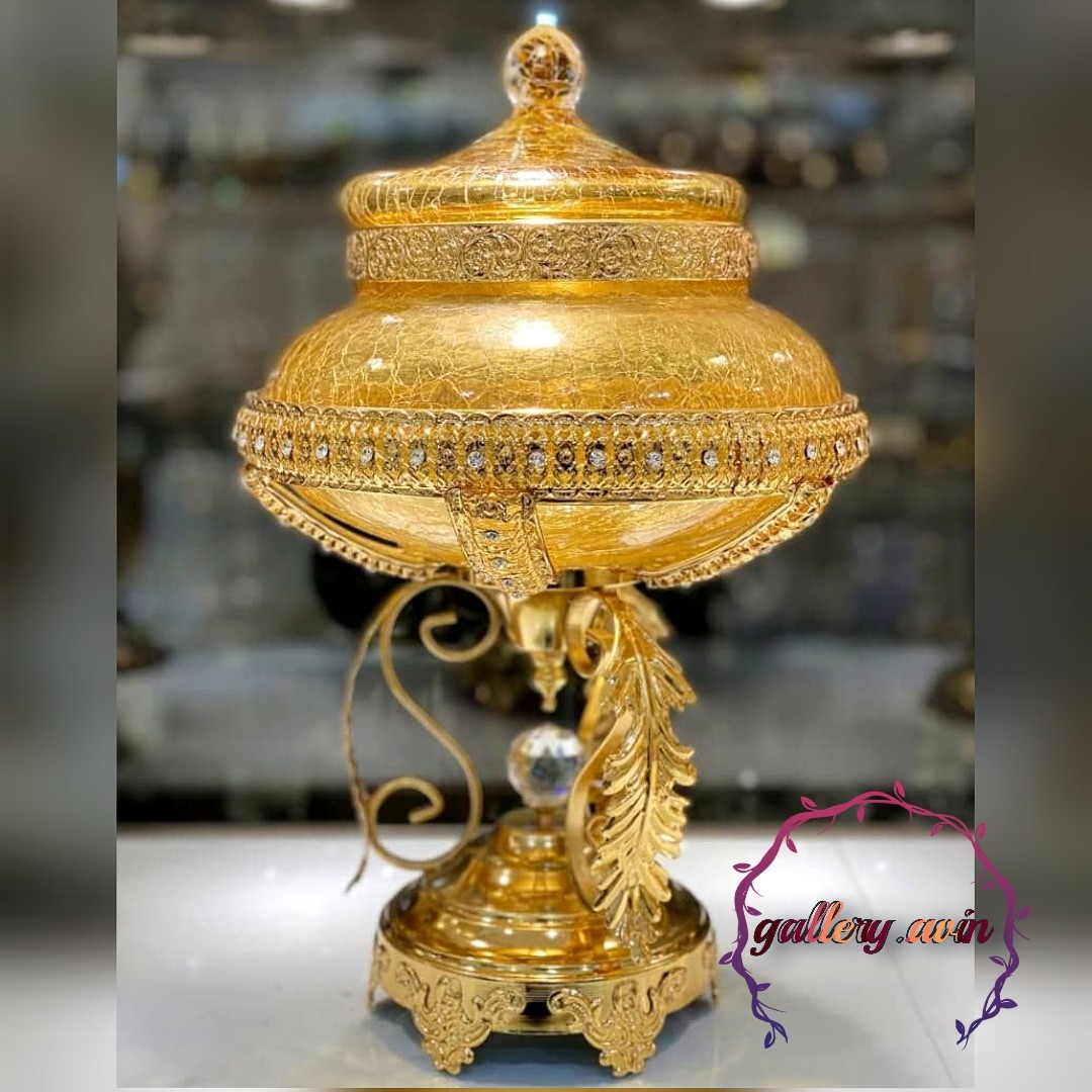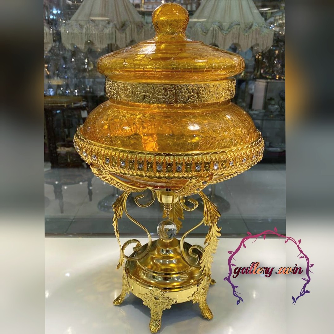 شکلات خوری پایه دار طلایی نگین دار شیشه تَرَک این شکلات خوری از پایه و بدنه فلزی با رنگ طلایی است روی این ظروف با نگین کار شده است که باعث زیبایی دو چندان این ظروف شده است ظرف شکلات خوری از جنس بلور شیشه تَرَک طلایی میباشد آبکاری این ظروف از نوع فورتیک طلایی و از برند معروف و خوش نام MBM است. این ظروف زیبایی خاصی را به منزل شما میبخشد