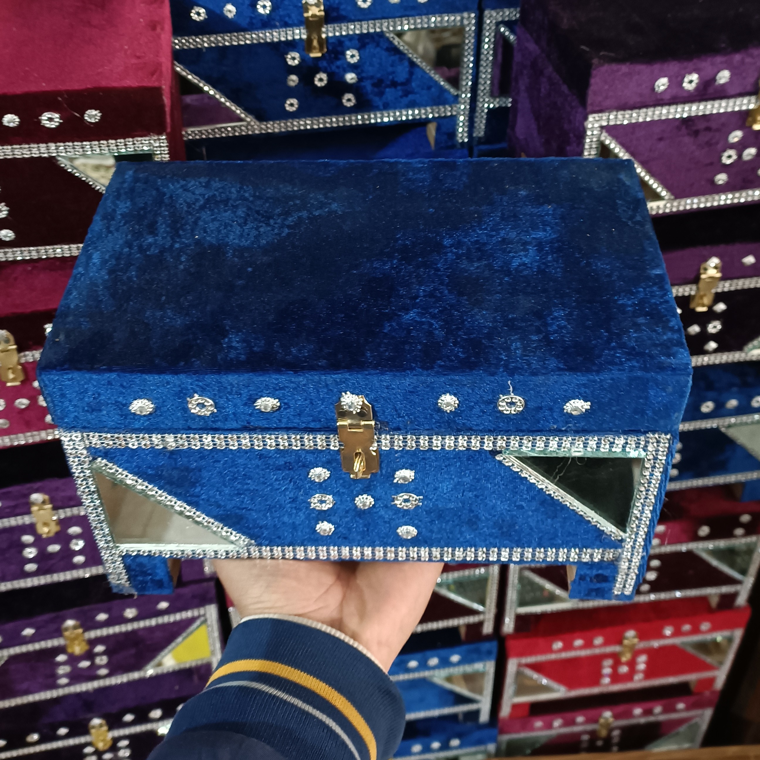 صندوق چوبی سایز متوسط رنگ آبی دور صندوق تزیین شده و بسیار مناسب برای وسایل شخصی
