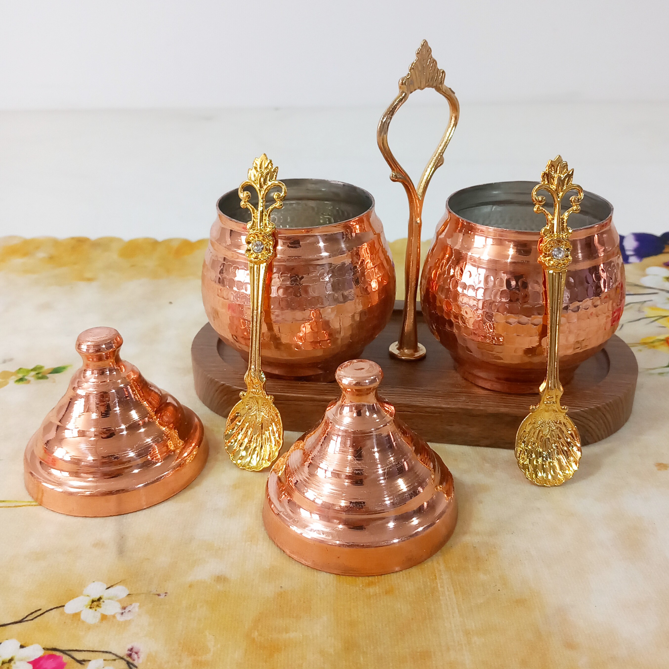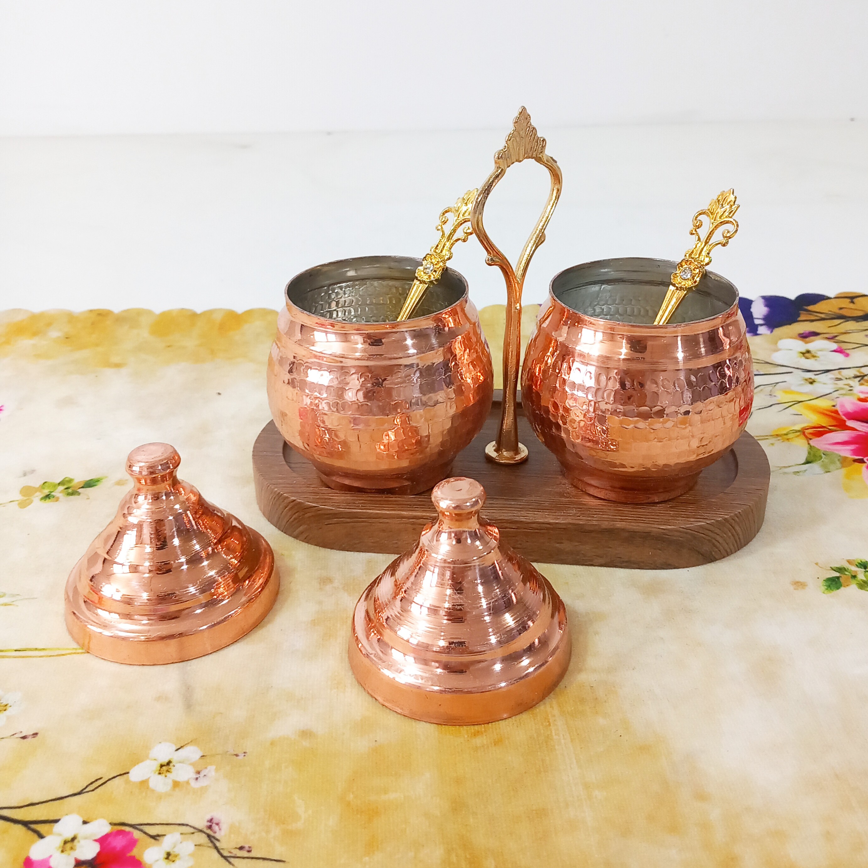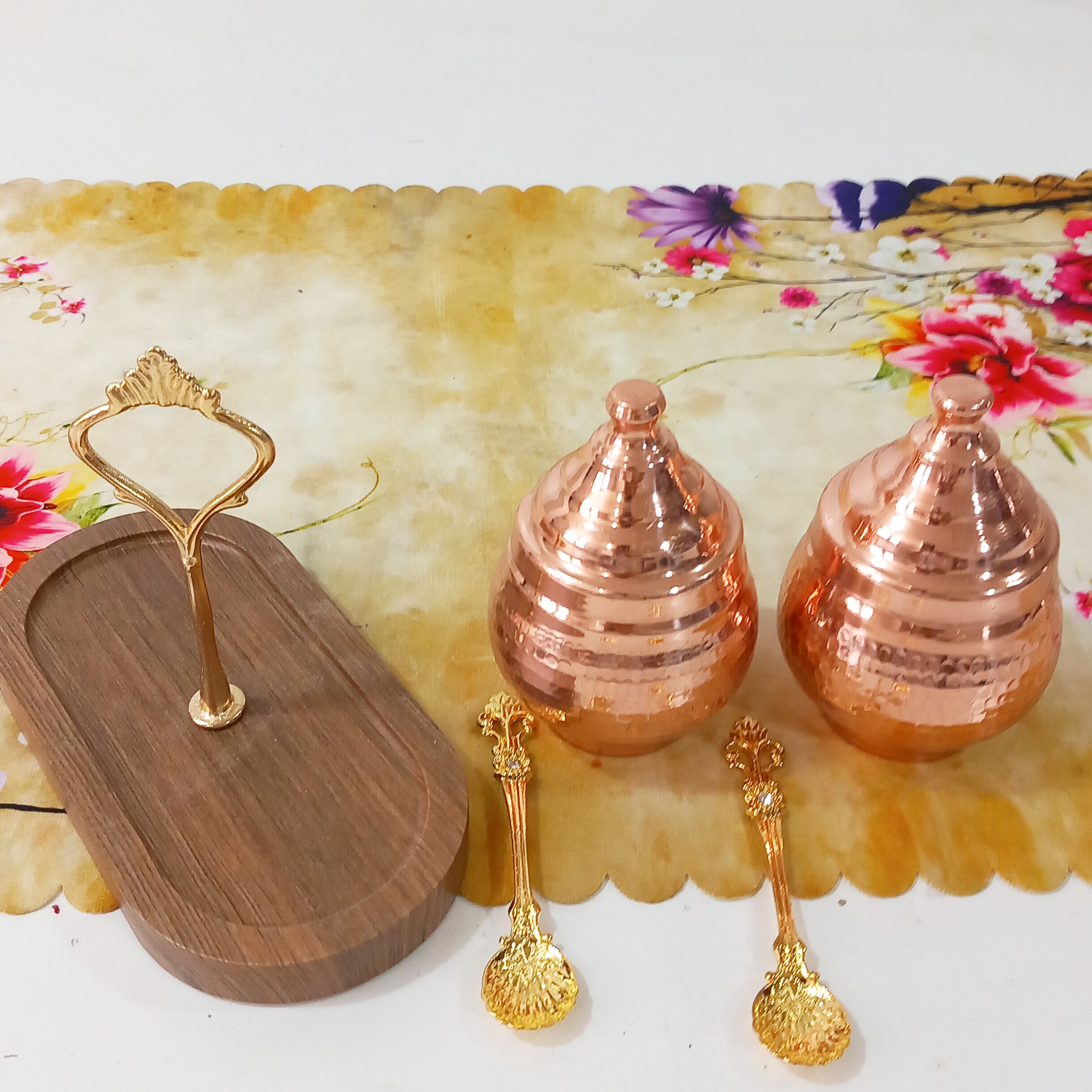 مربا خوری مسی دوتایی قاشق دار با استند چوبی همچنین مناسب ادویه مبلمونسرا مدل 288612
