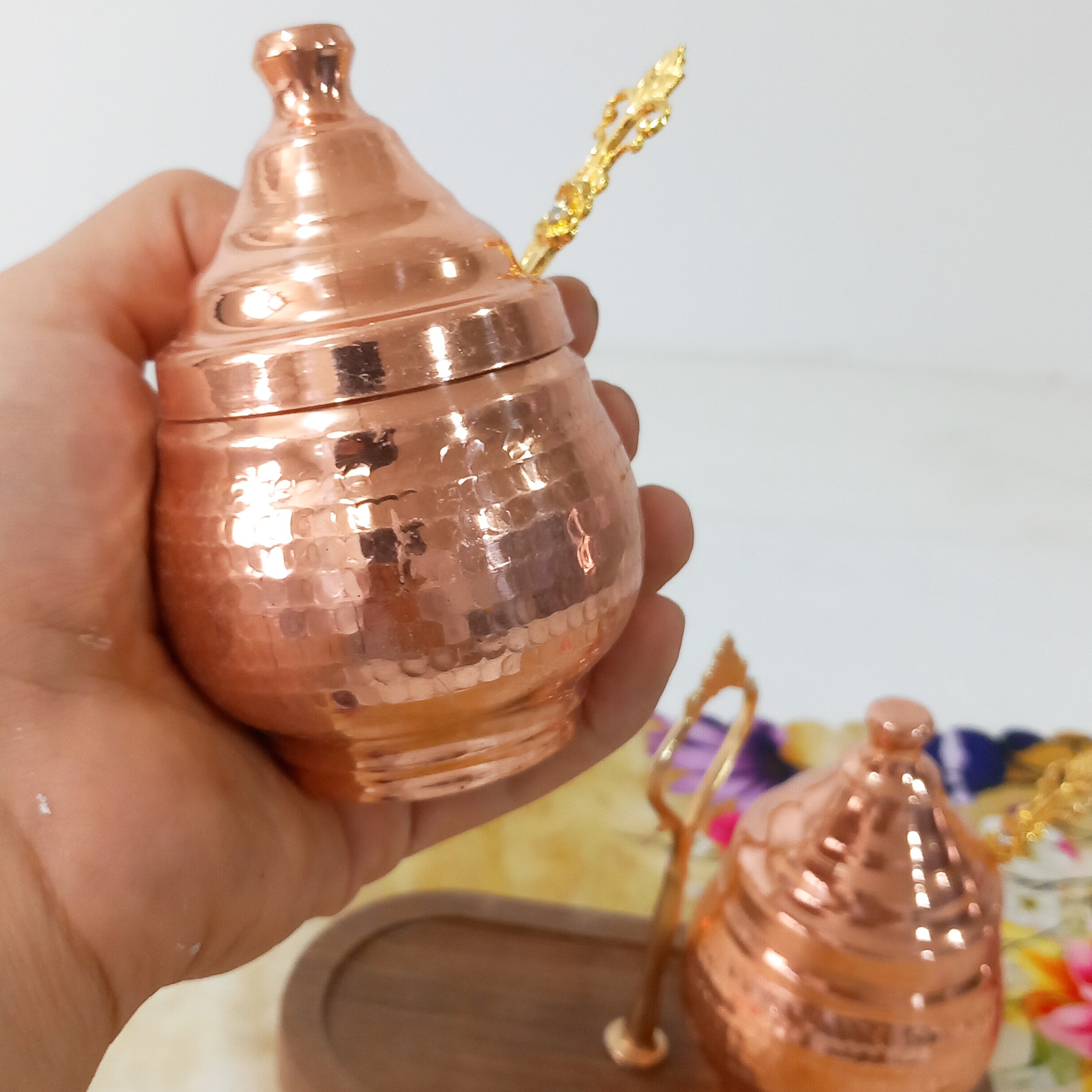 مربا خوری مسی دست ساز زنجان مدل دوتایی چکش کاری شده و داخل قلع کاری شده قاشق دار و دارای استند چوبی این کار نانو شده و رنگ ثابت است و همچنین مناسب