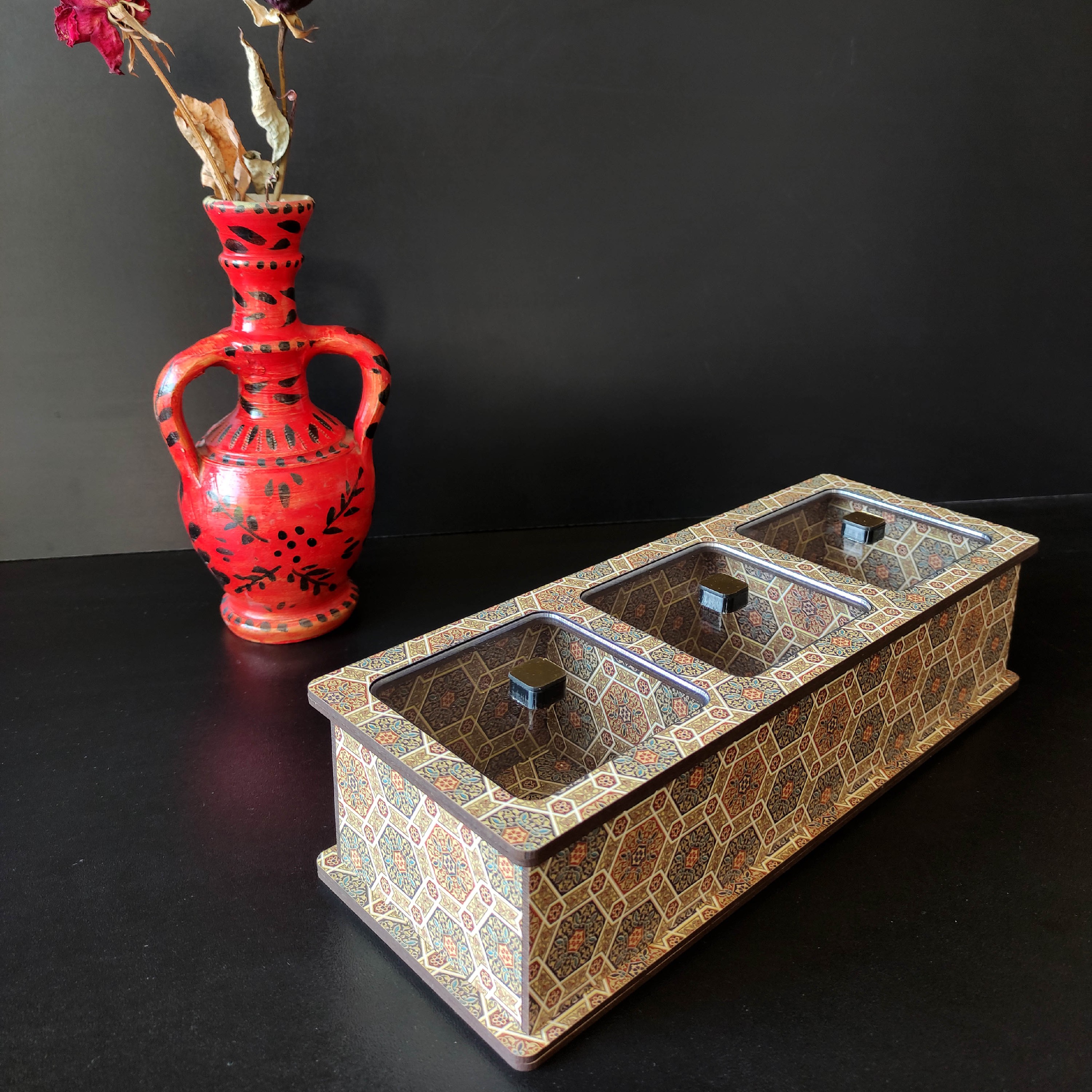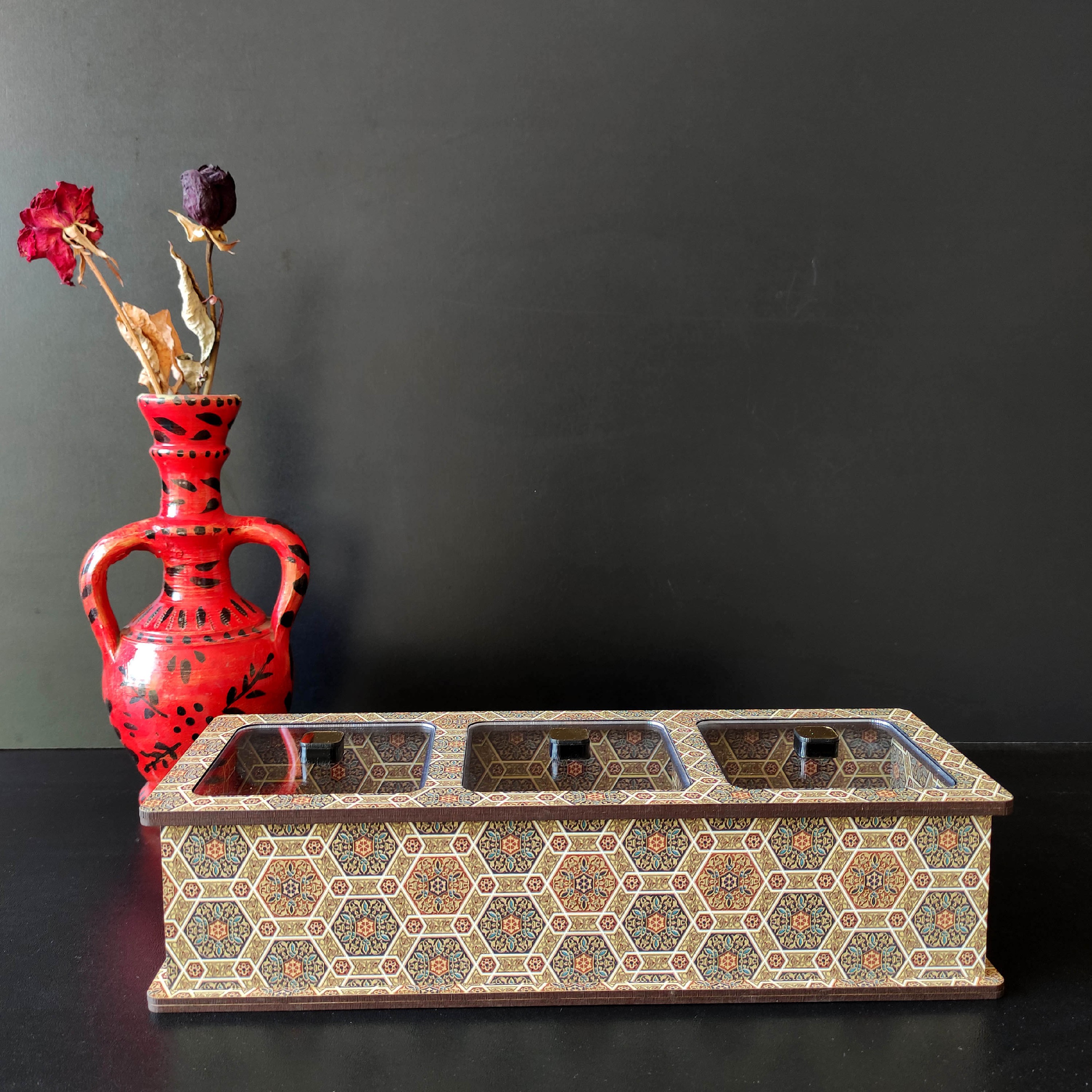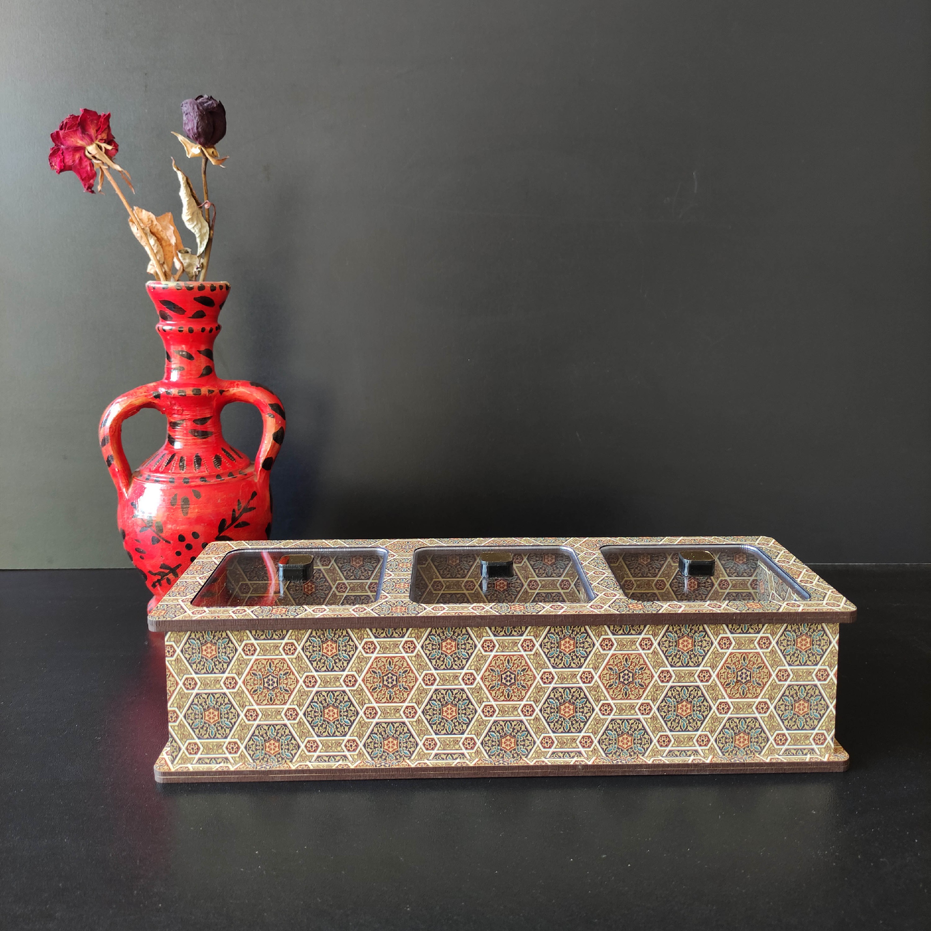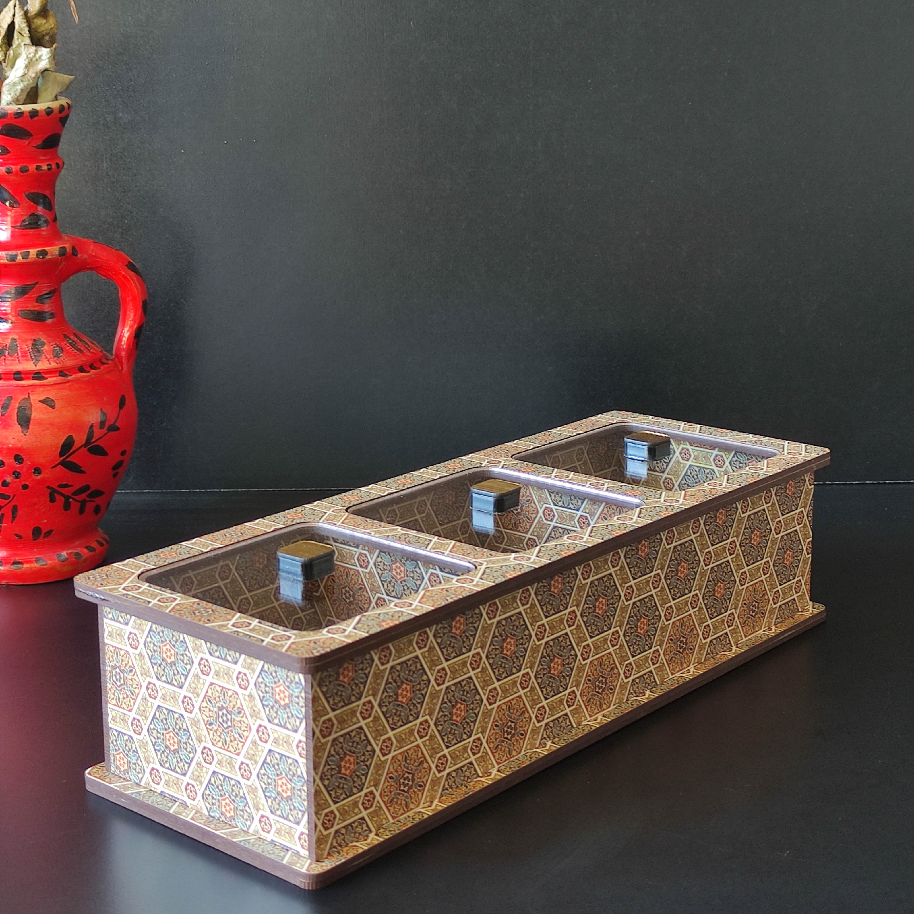 جعبه پذیرایی سه خانه ،آجیل خوری چوبی طرح مینا کاری ،شکلاتخوری جعبه دمنوش مبلمونسرا مدل 265367