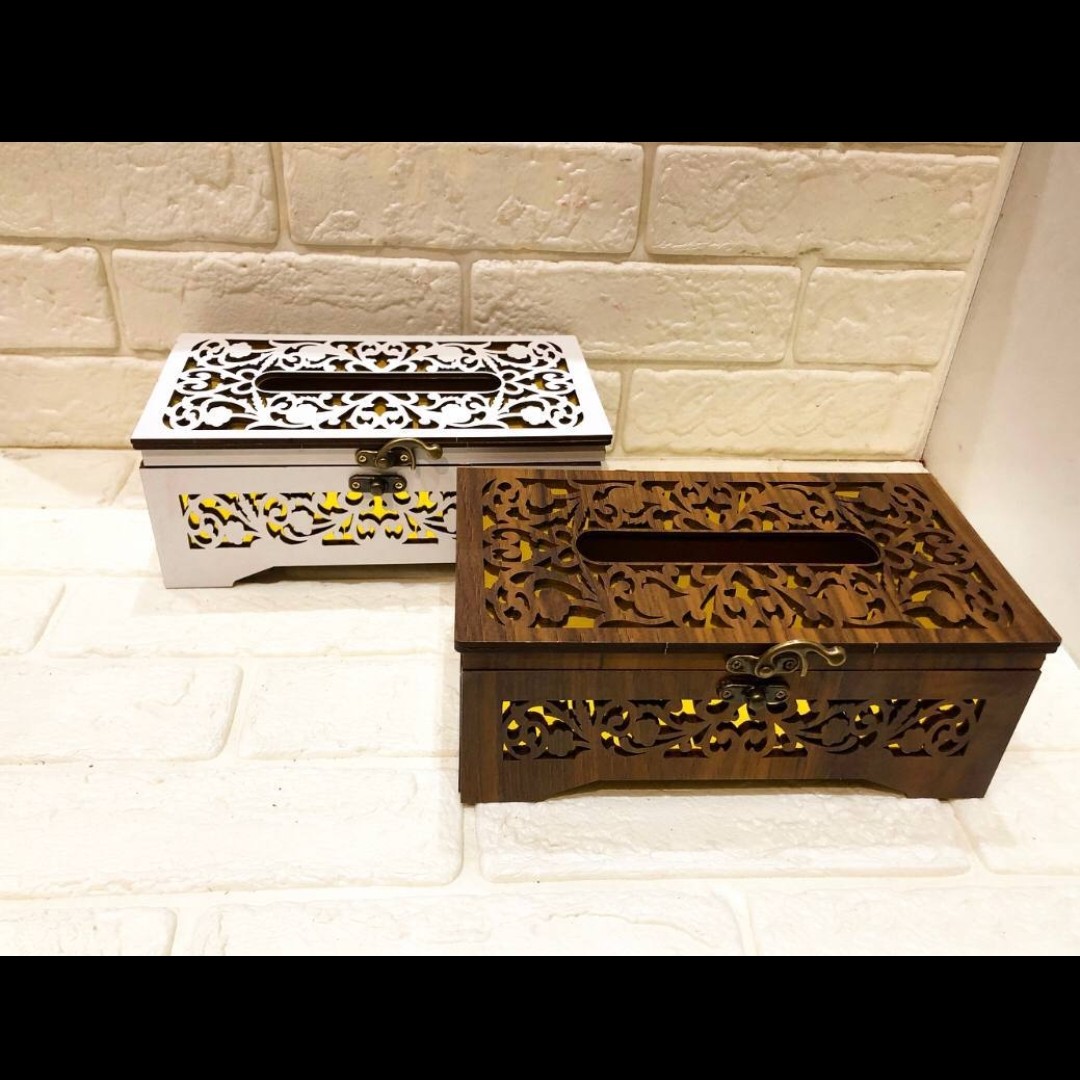 جای دستمال کاغذی چوبی طلا کوب در دو رنگ سفید و قهوه ای موجود هستش درب قفلی داره که همانند صندق باز و بسته میشه،با توجه به ظاهر زیبایی که داره مجلس شمارو زیبا تر میکنه،با این قیمت و ظاهره زیبا بهترین انتخابه،بیایم دستمال کاغذی رو با همون جای پلاستیکی یا کاغذیش دیگه سر سفره یا میز پذیرایی نذاریم🙂