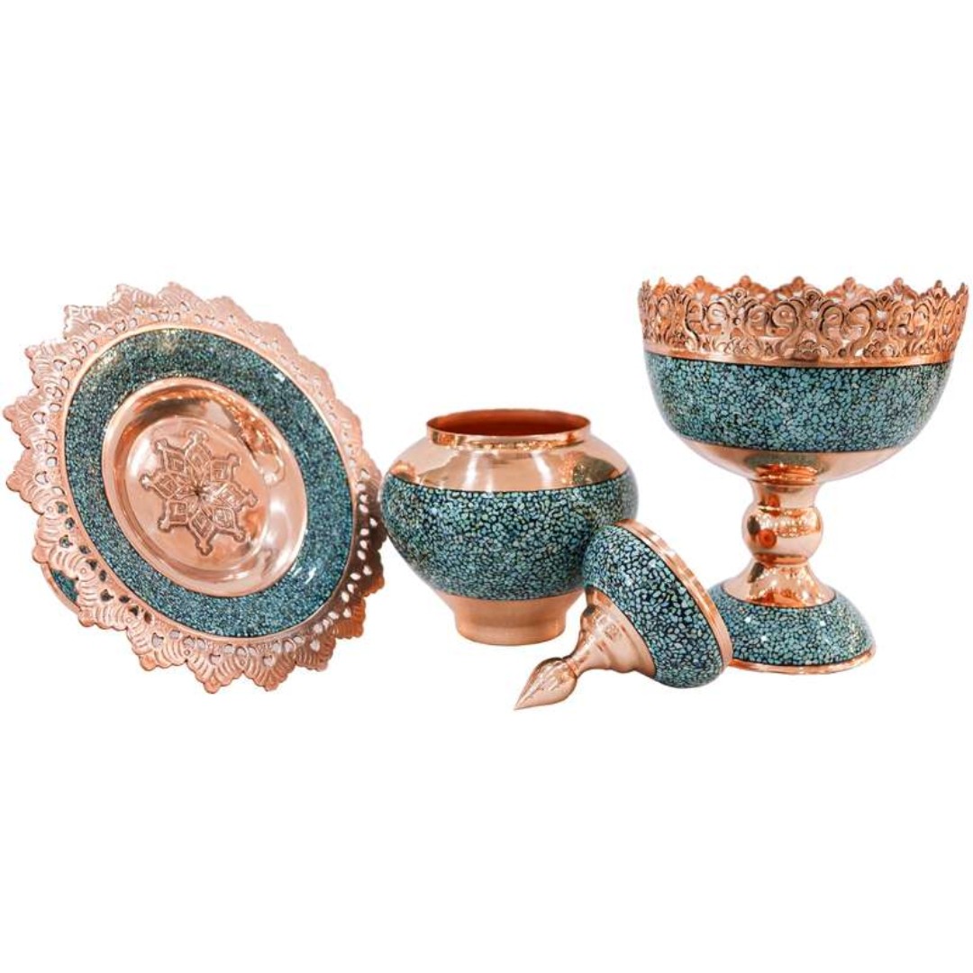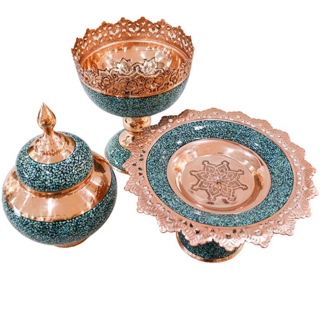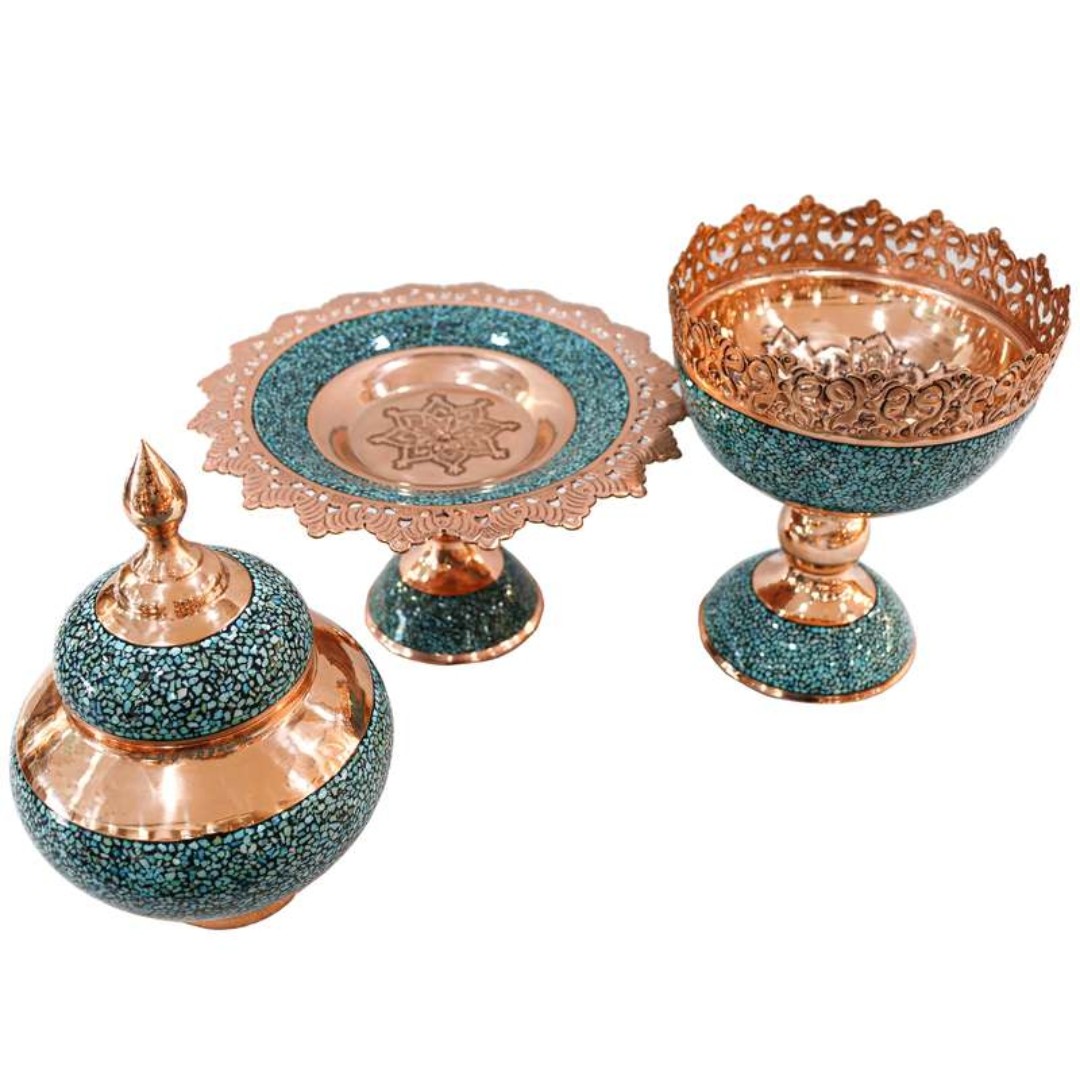 ست سه تکه سرویس فیروزه کوبی نیشابور شیرینی خوری و آجیل خوری و قندان یا شکلات خوری فیروزه کوبی 22 س صنایع دستی سایروس مبلمونسرا مدل 264731