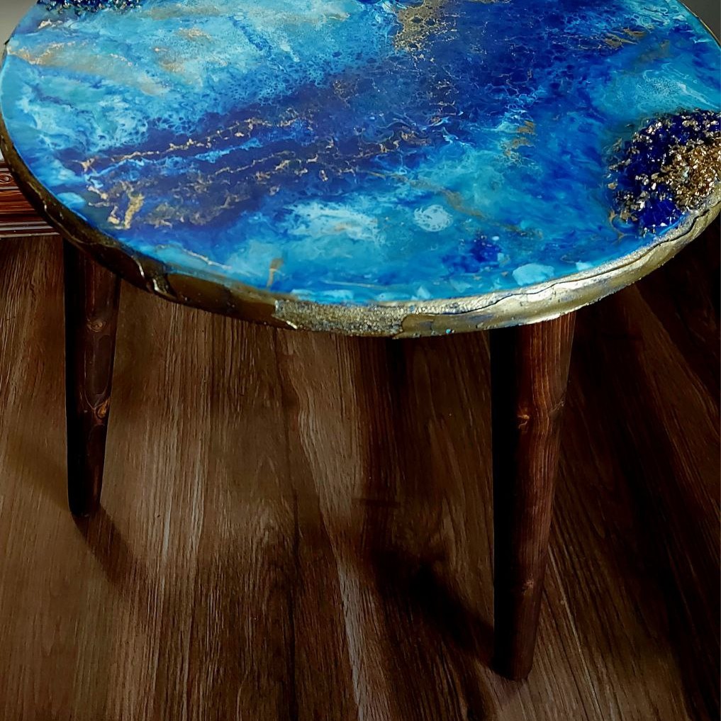 میز عسلی دایره رنگ و مدل به انتخاب شما ، کار شده با رزین و سنگ کریستال ، لبه های کار پتینه شده ، رنگ به دلخواه شما