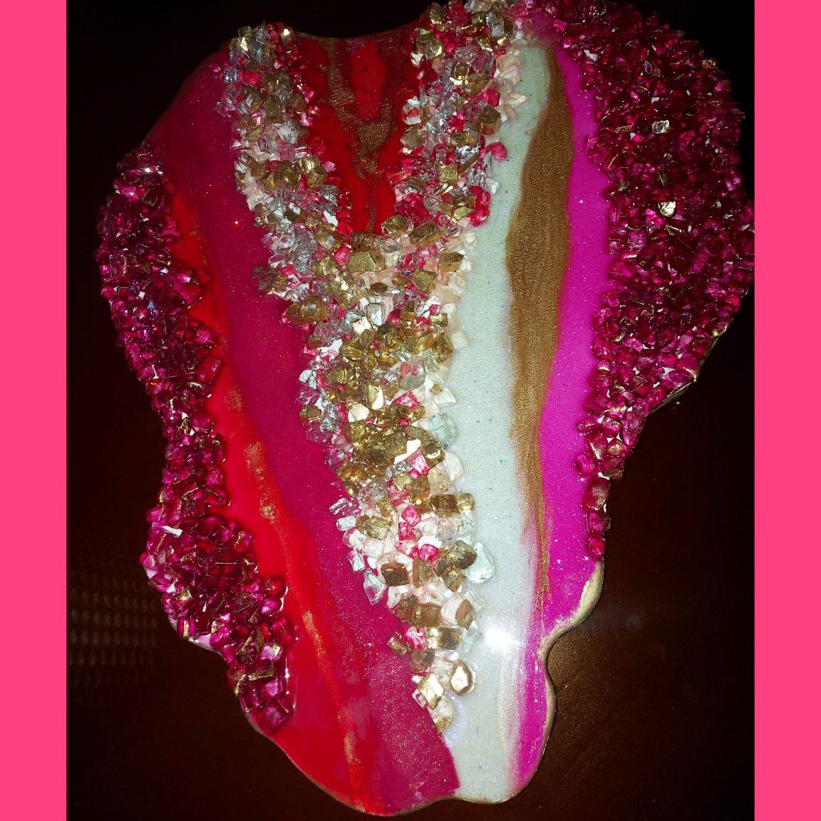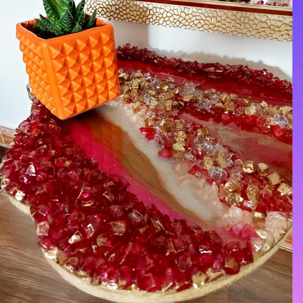 میز عسلی جنس چوب ، طرح ژئود ، کار شده با رزین و سنگ کریستال ، ارتفاع پایه ها ۷۰ سانت ، پایه ها باز و بسته می شود ،