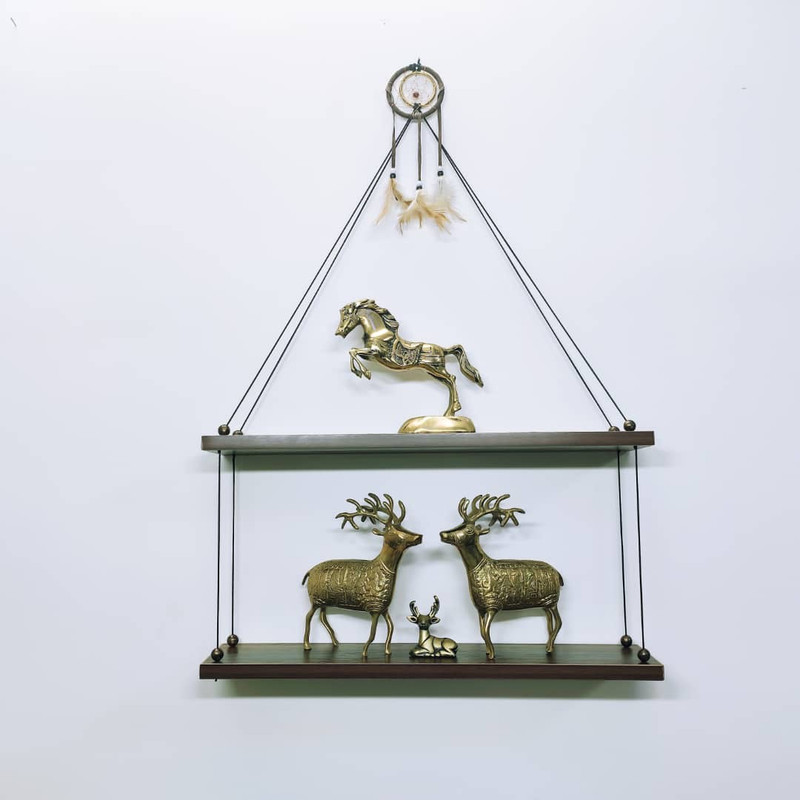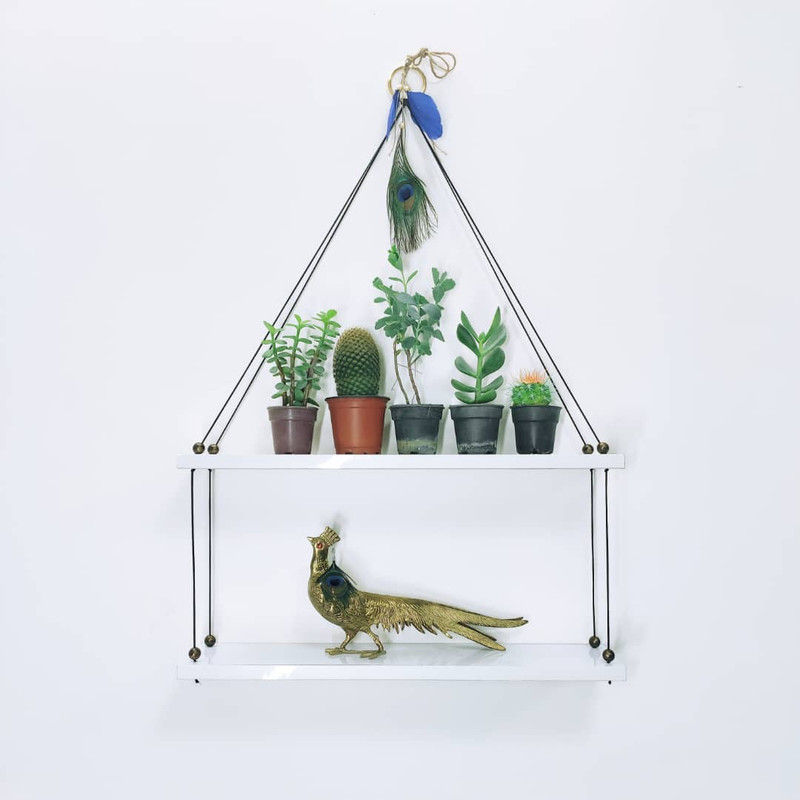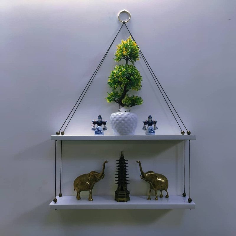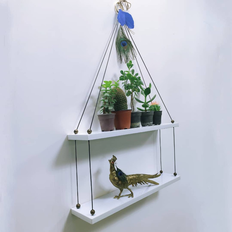 شلف دیواری طرح طاووس داری دوطبقه قابل استفاده برای تمام دکوری ها و گلدان و کتاب های کوچک با قابلیت نصب ان. از این محصول میتوانید به عنوان جا ادویه در آشپزخانه نیز استفاده کنید جنس این شلف از MDF است