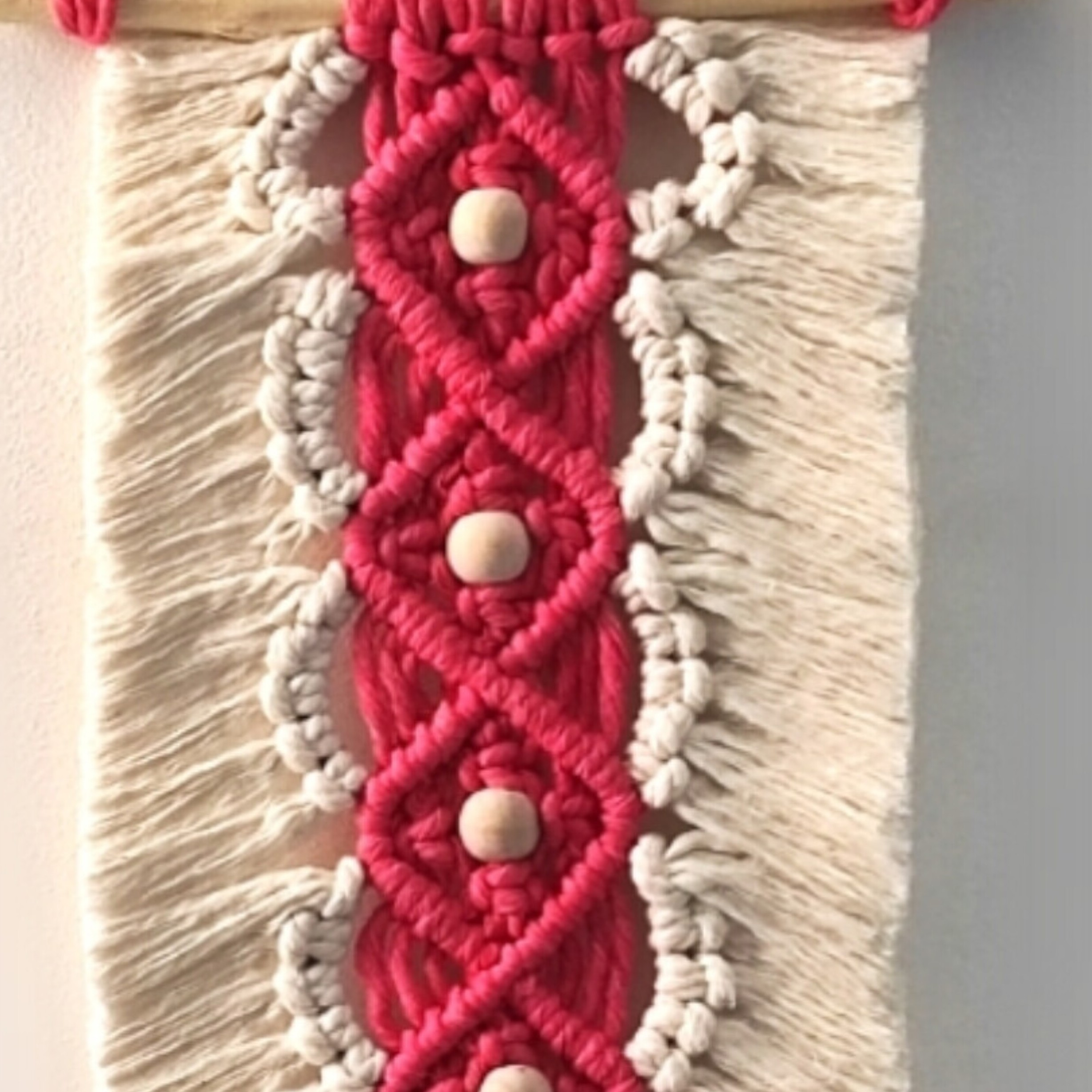 دیوار کوب مکرومه کتان با مکرومه کتان نرمتاب بافته شده رنگ سفید و صورتی و مهره چوبی