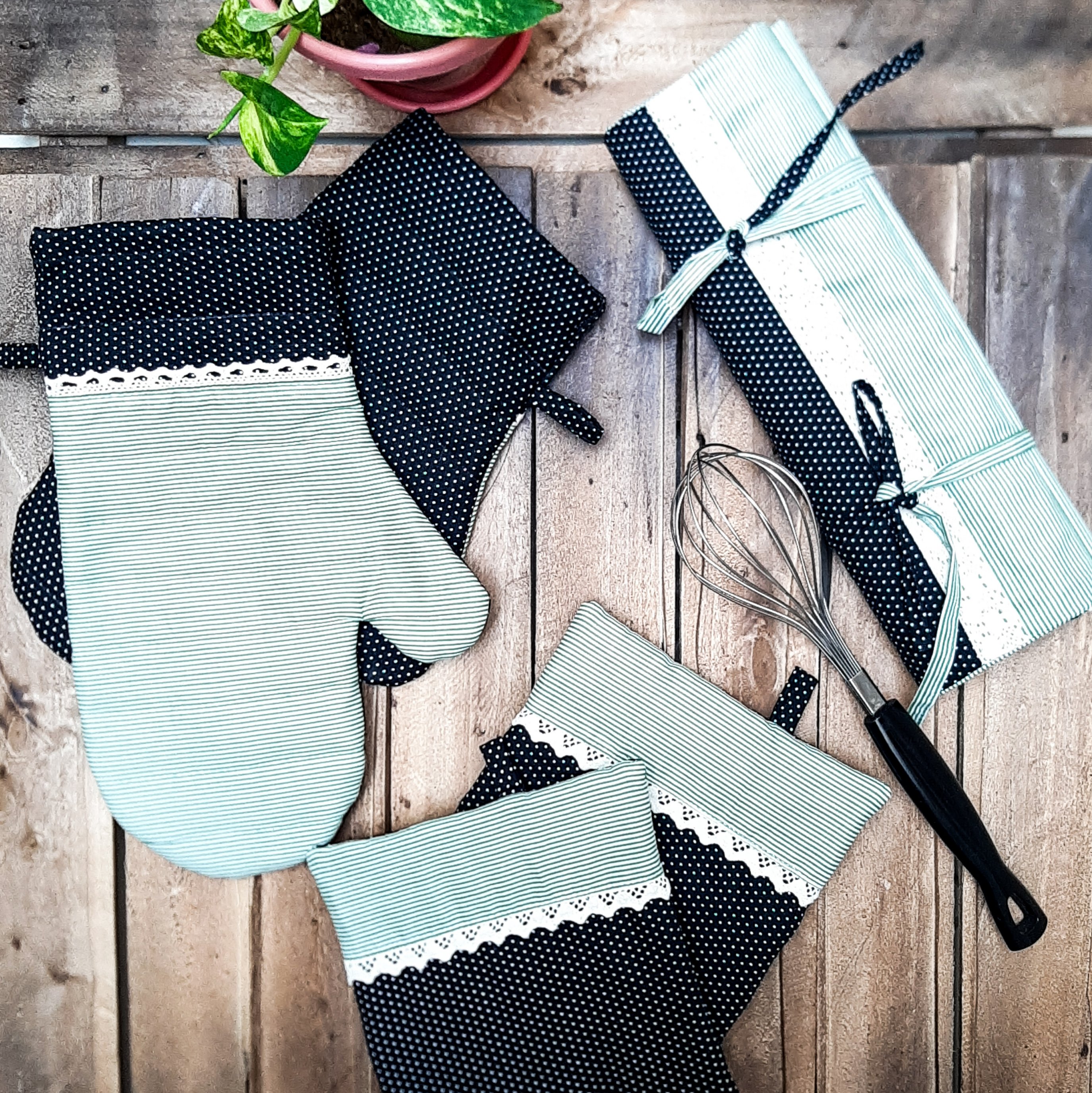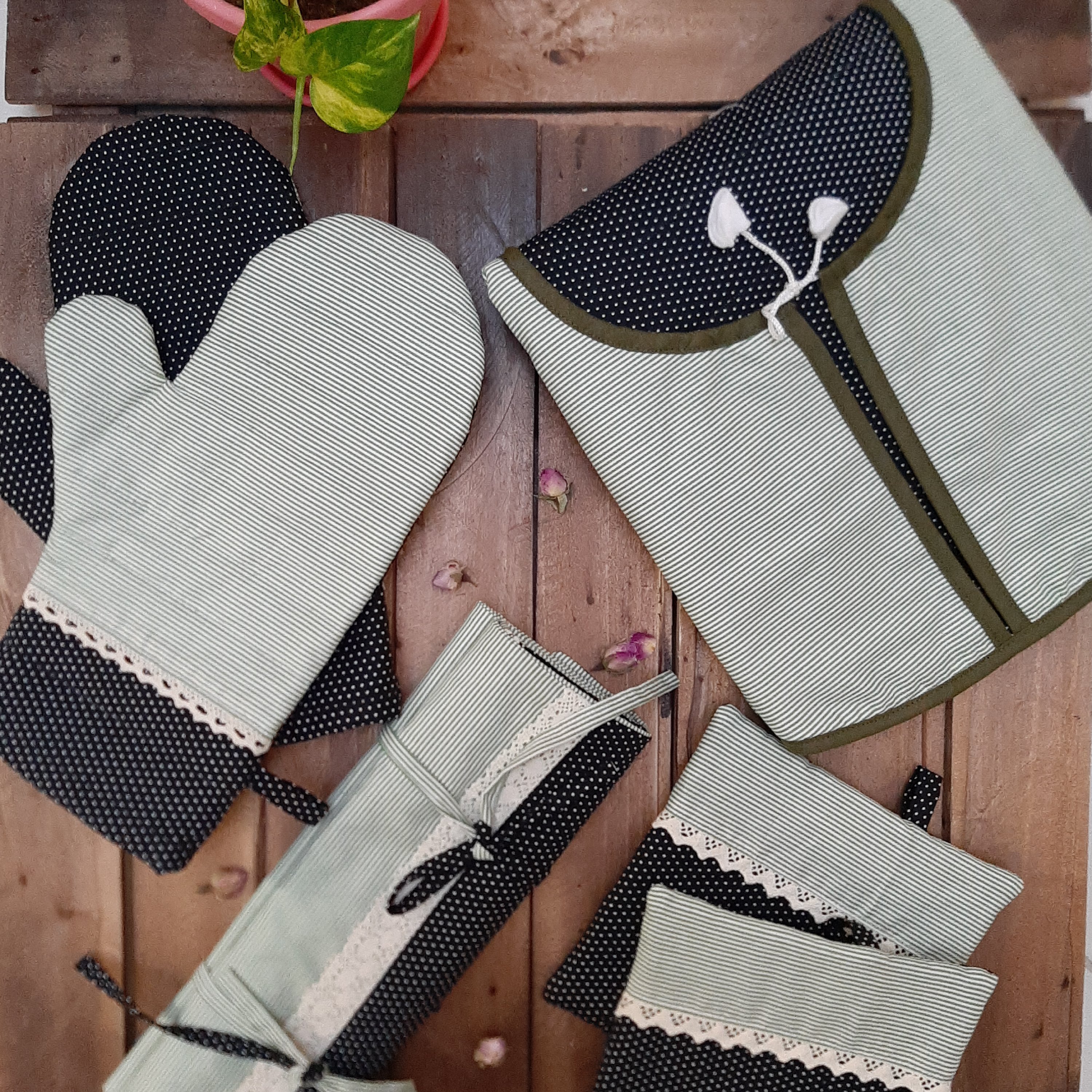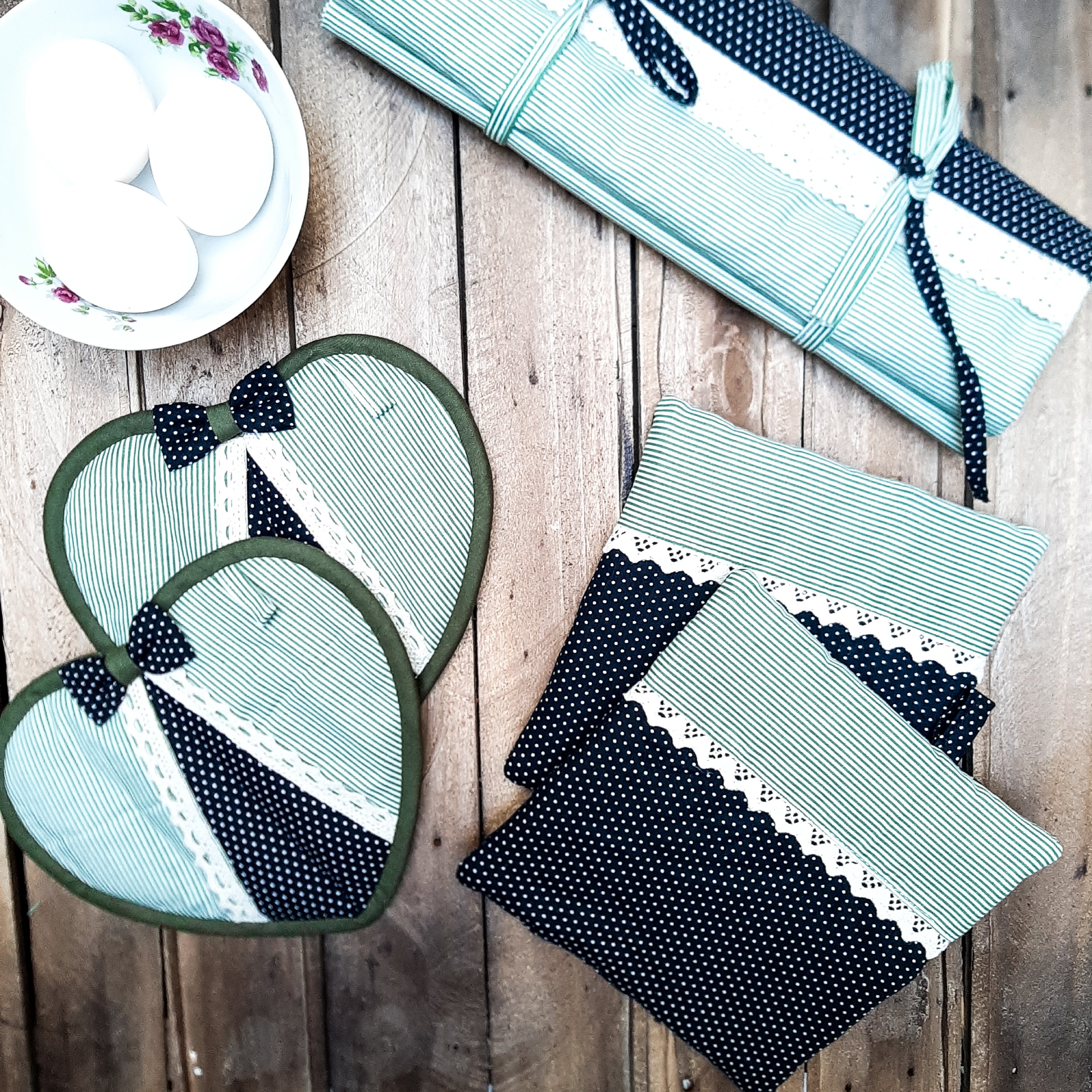 ست 9تیکه سبز راه راه شامل : 👈 : نمگیر مخصوص ظروف خیس 👈 : پیشبند دامنی 👈 : یک جفت دستگیره قلبی 👈 : یک جفت دستگیره چارگوش 👈 : یک جفت دستکش فر 👈 : کاور قابلمه مخصوص پیک نیک و بیرون رفتن 🌱سرویس قابلیت تغییر رنگ و اندازه و کم و زیاد کردن محصولات را دارد.