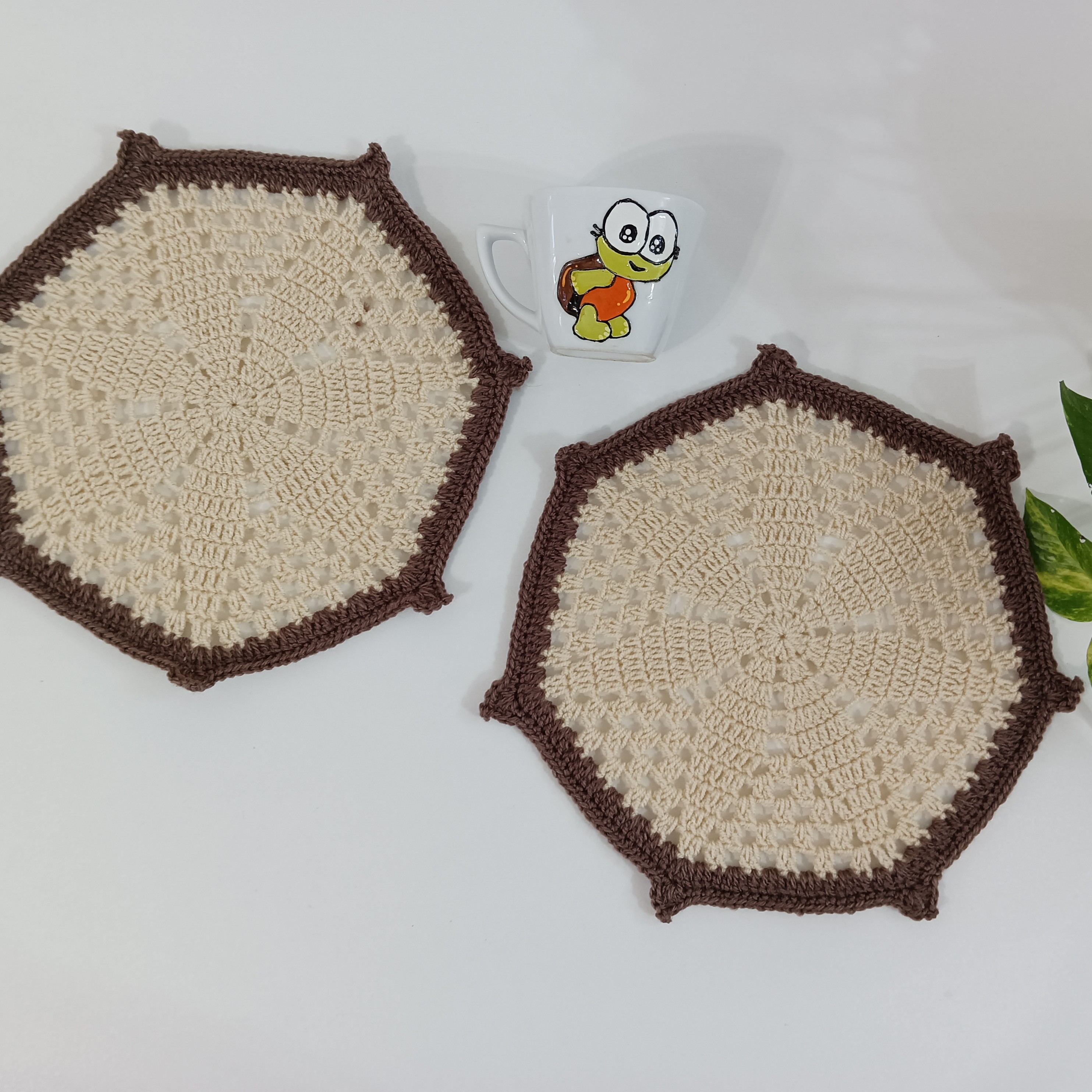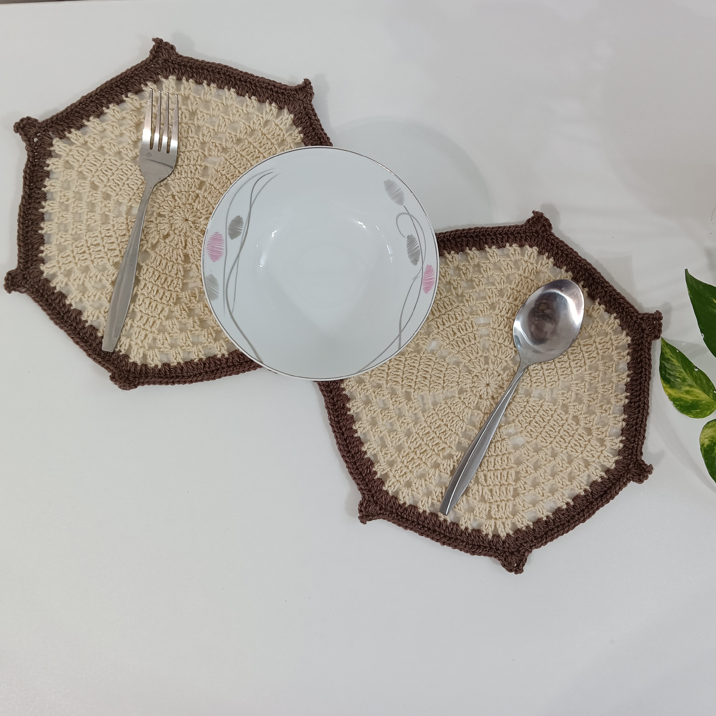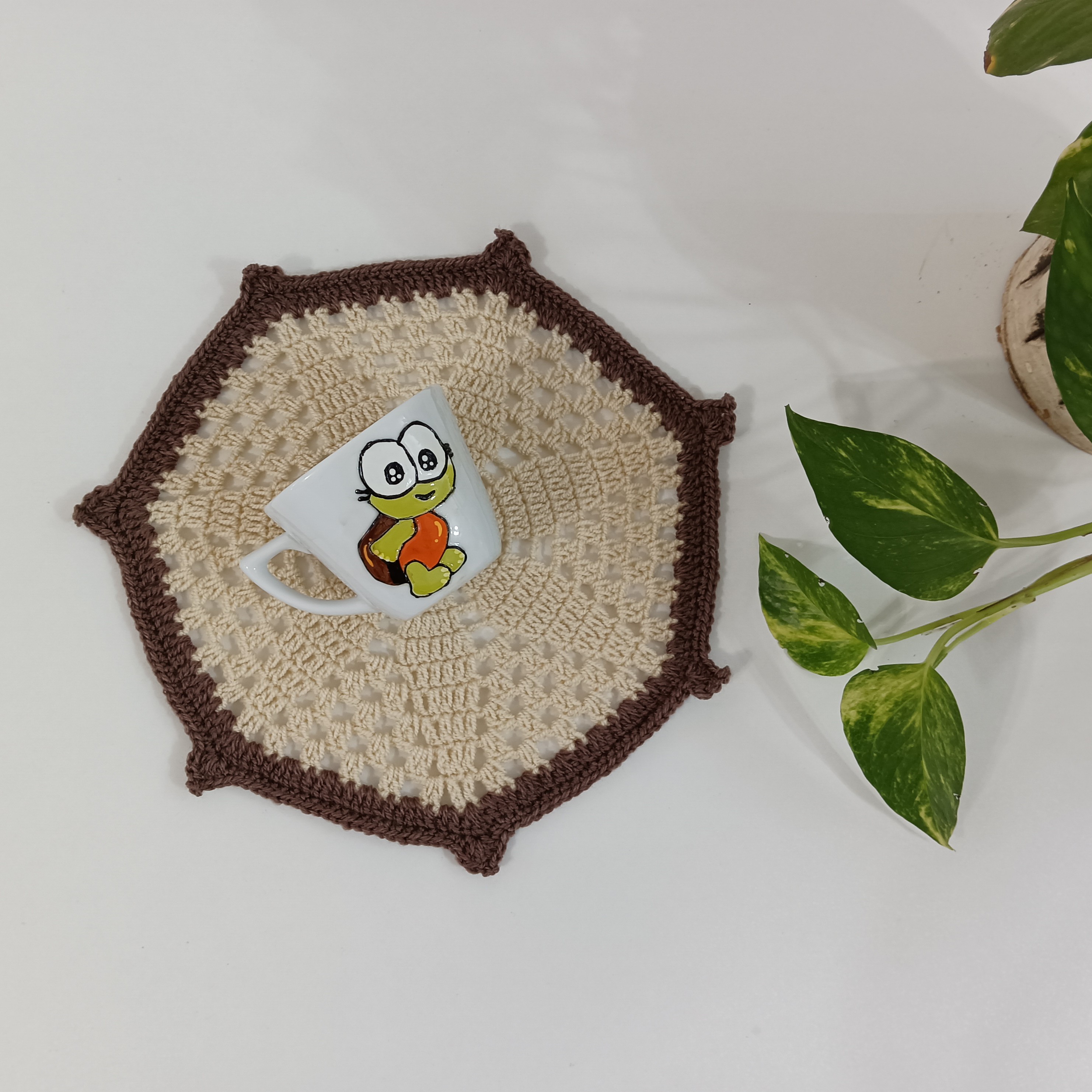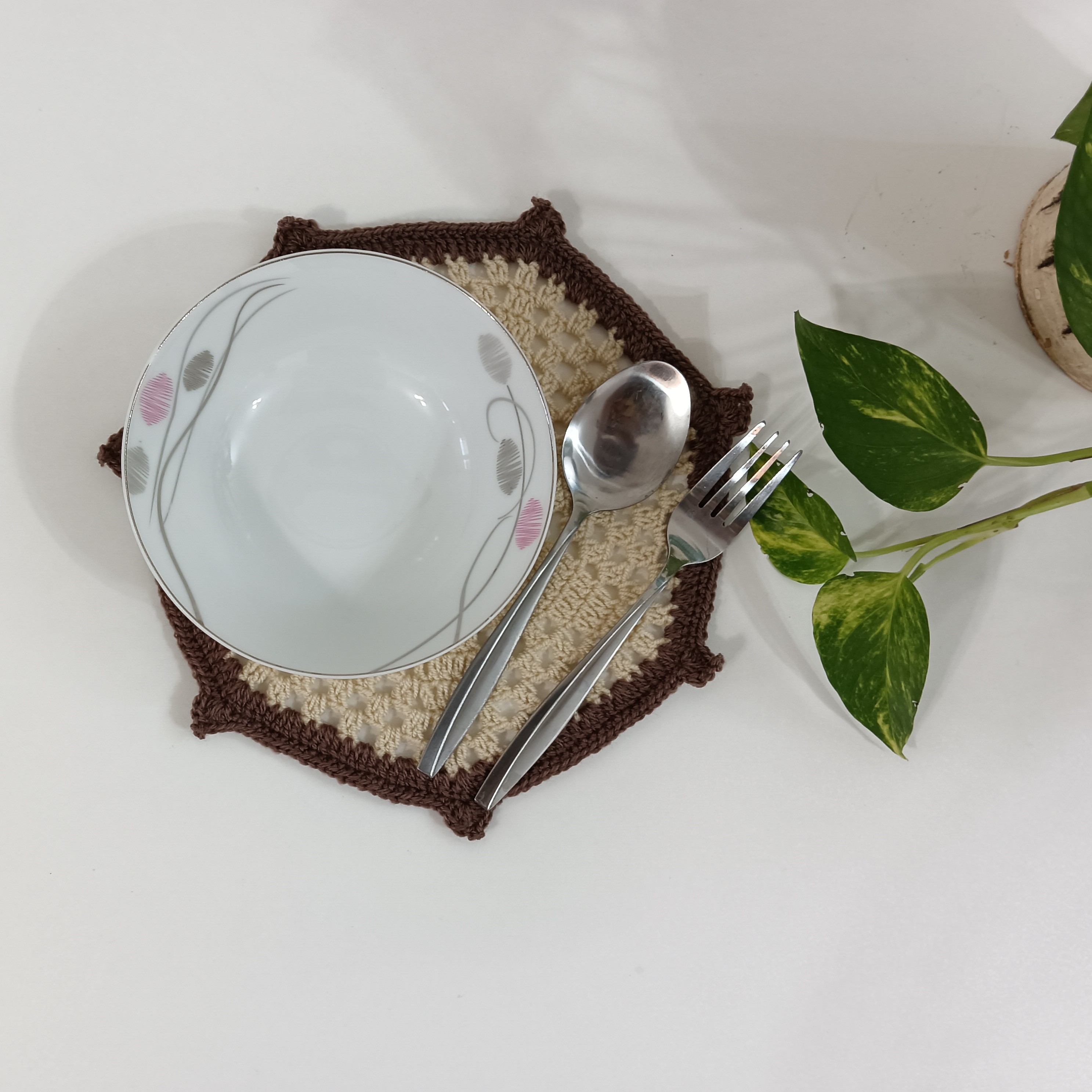 زیر بشقابی بافتنی کرم قهوه ای طرح سکان کشتی مبلمونسرا مدل 301711