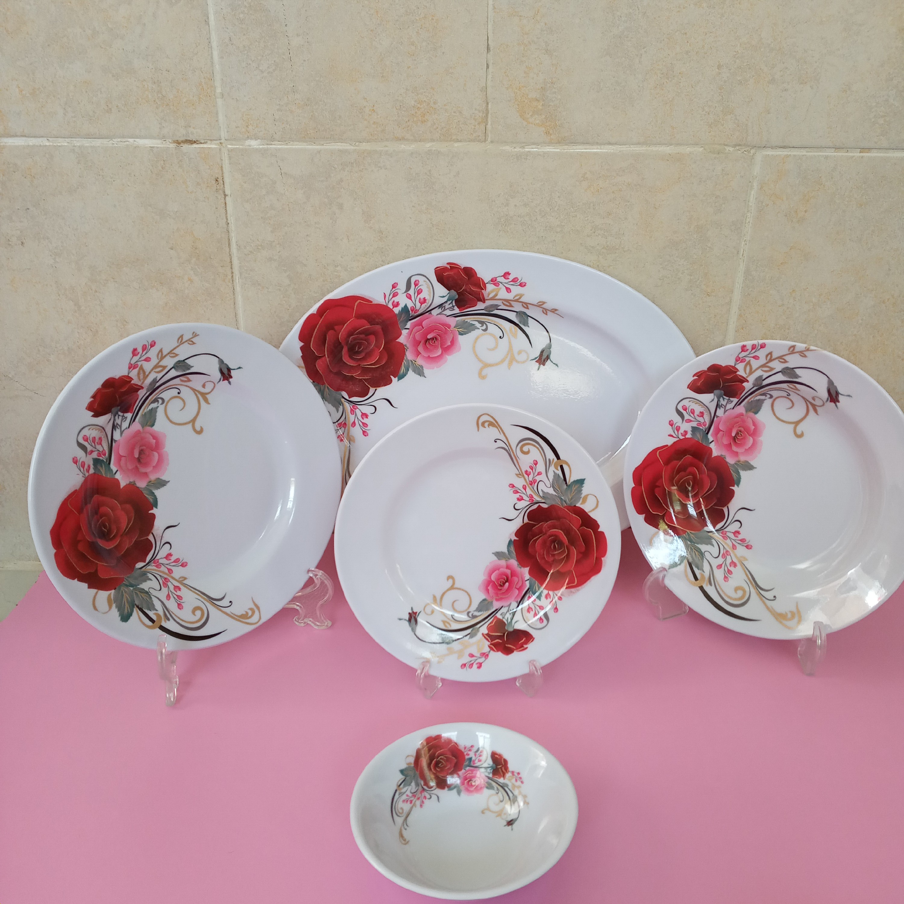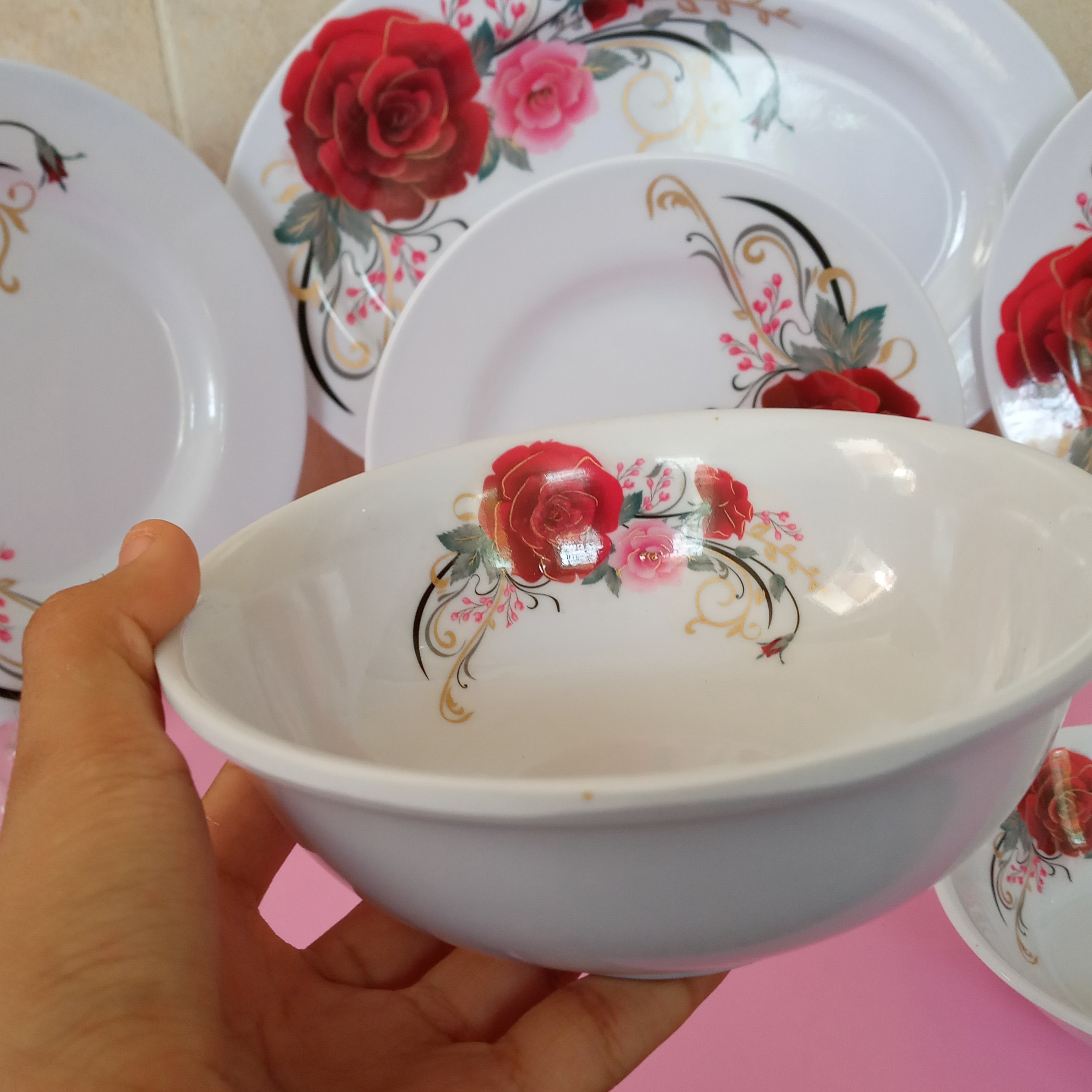 سرویس ملامین ۲۵ پارچه مارک سپید یزد دارای استاندارد جنس درجه یک تولید کارخانه یزد ملامین اصل سرویس ۳۱ پارچه ۶ نفره شامل " ۶ عدد برنج خوری سایز ۲۵ ۶ عدد خورشت خوری سایز ۲۲ ۶ عدد میوه خوری سایز ۱۹ ۶ عدد ماست خوری سایز ۱۳ در ۴ یک دیس برنج بزرگ سایز ۳۶ در ۲۵.۵ دارای نشان استاندارد توجه "" از یک متری بیافتد نمیشکند ! مناسب برای جهیزیه و ... سبک و مقاوم رنگ گل رز قرمز