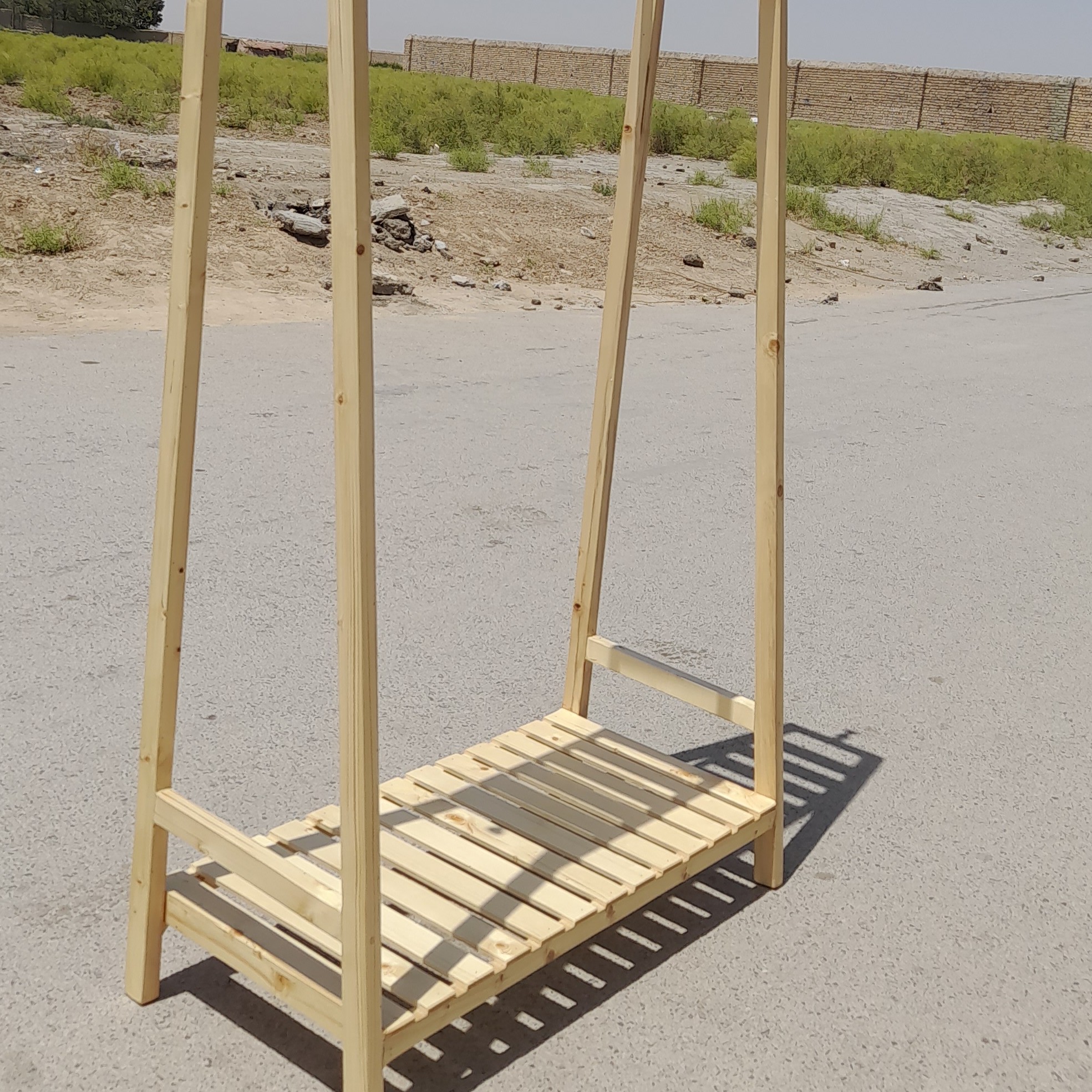 رگال لباس مدل ذوزنقه به رنگ کرم روشن ابعاد این نمونه رگال به طول ۱متر در ارتفاع ۱۷۵سانتی و عمق ۴۵ سانتی متر میباشد و دارای تاج به عرض ۳۰ سانتی متر و دوطرف رگال دارای دستک برای آویز کیف
