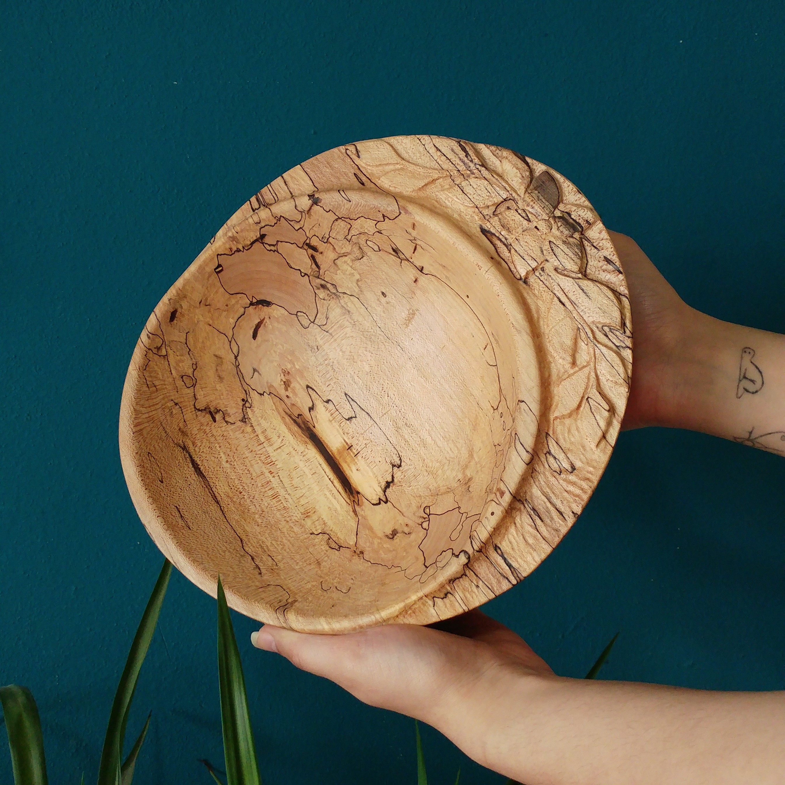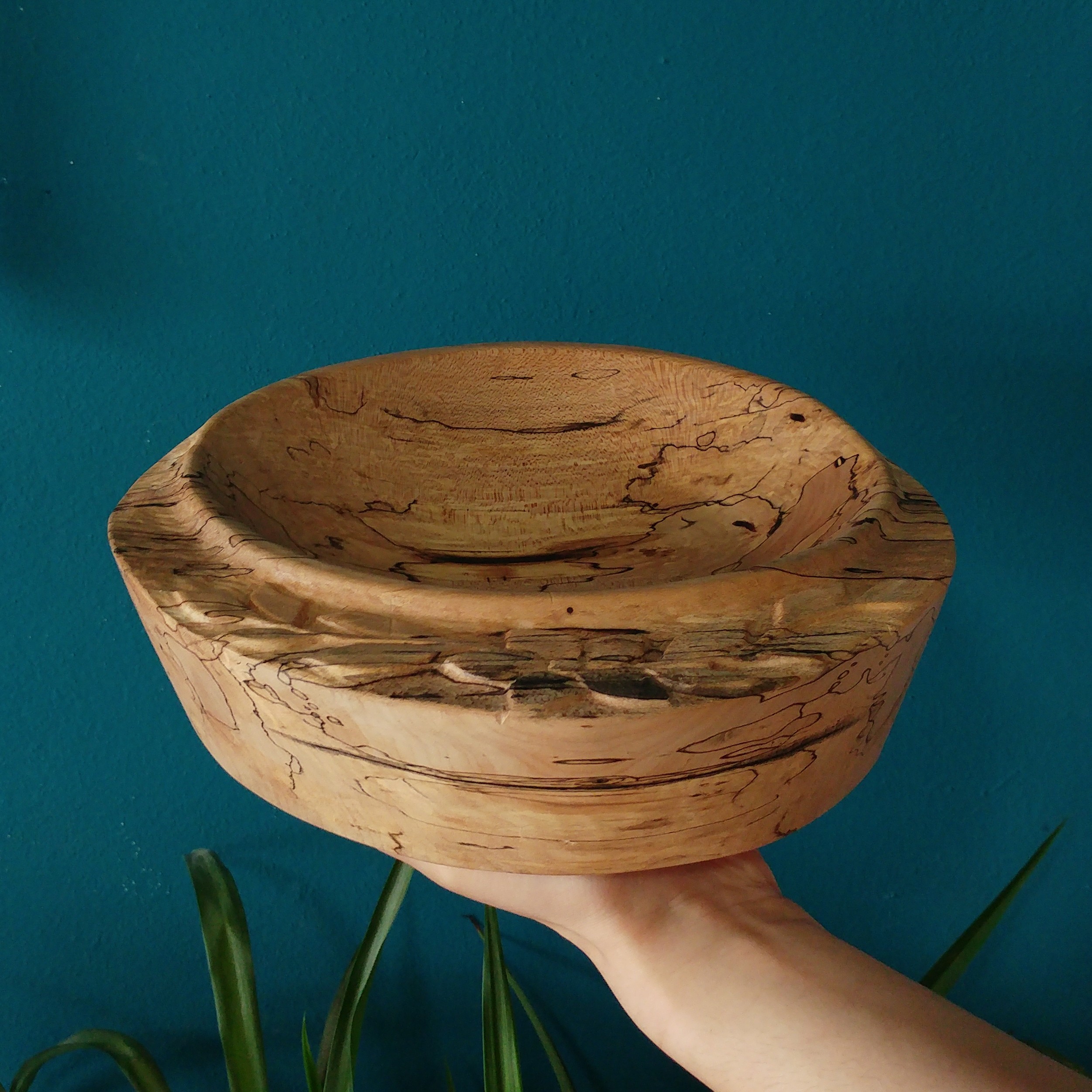 ظرف پذیرایی و میوه خوری ساخته شده از چوب راش با پوشش گیاهی آبگریز و محافظ آرسس گل منبت شده با دست قطر 28 و ضخامت 7 سانتی متر چوب قبلا در حالت طبیعی موریانه داشته ولی الان سوراخ ها با رزین پر شدن و فاقد موریانه می باشد