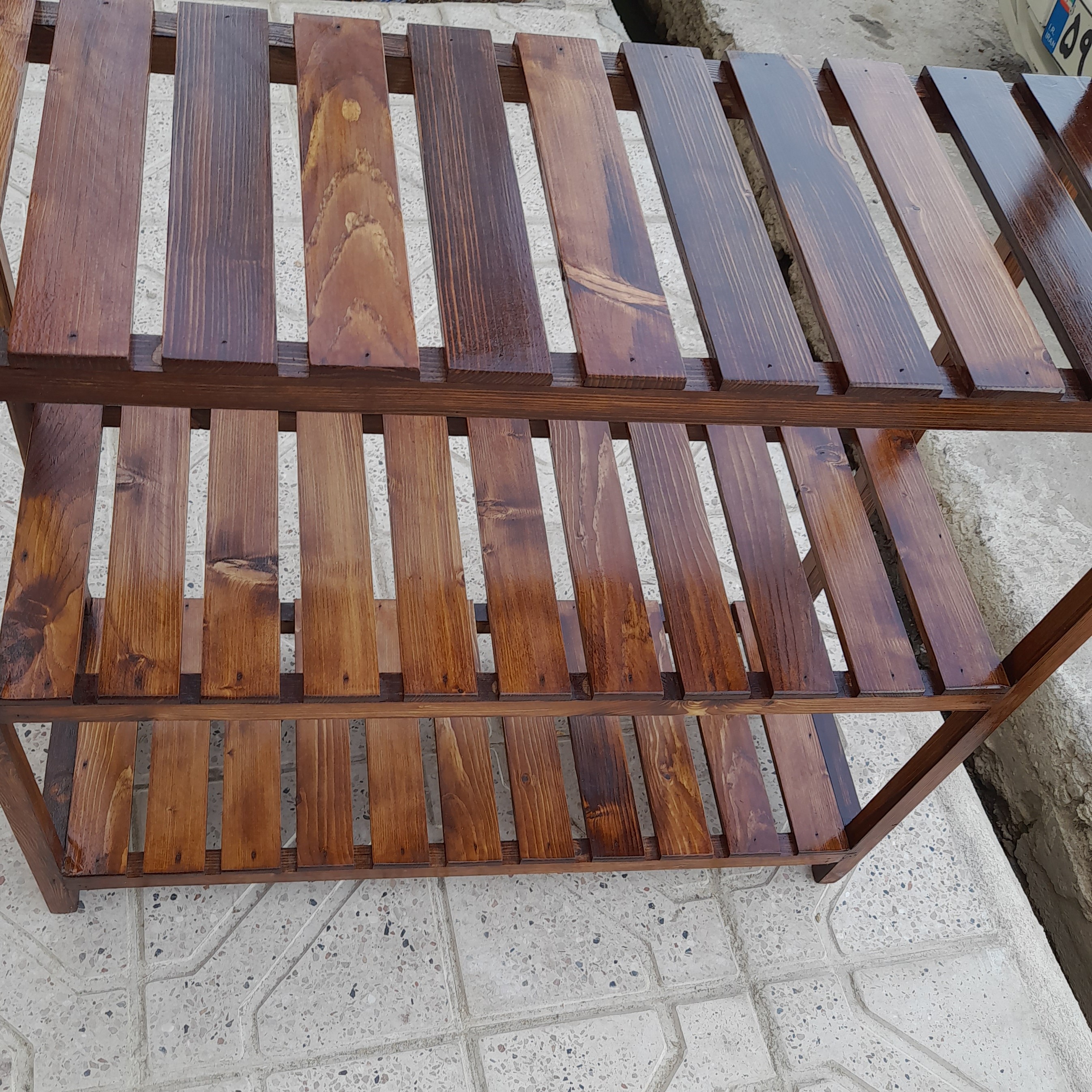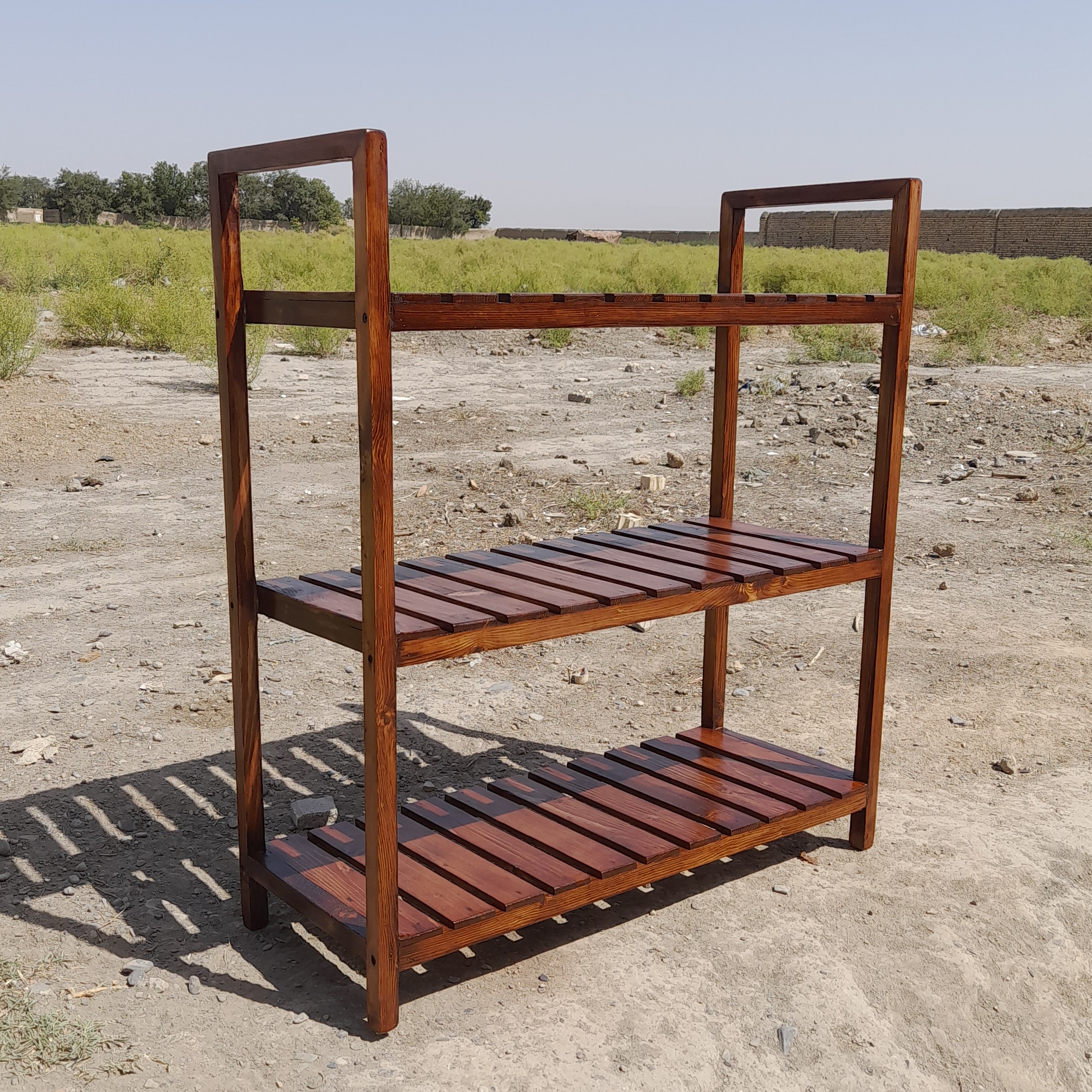 جاکفشی چوبی سه طبقه ابعاد این نمونه کار به طول ۸۲ سانتی متر در ارتفاع ۹۰ سانتی متر و عمق ۳۲سانتی میباشد فاصله بین طبقات ۲۸ سانتیمتر میباشد ساخته شده از چوب روس قابل سفارش در رنگبندی های قهوهای تیره و روشن و کرم روشن