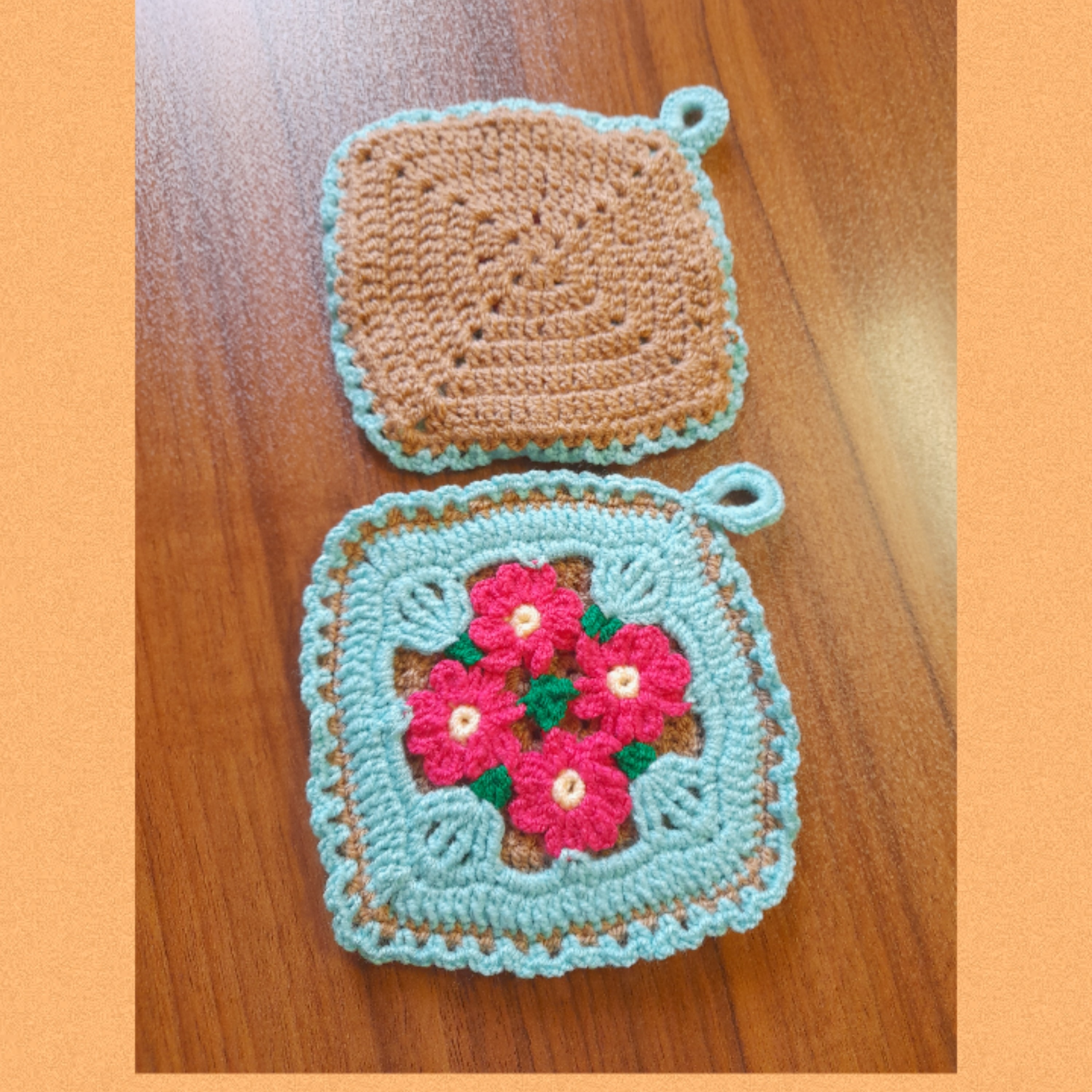 دستگیره دولایه گلهای ریزوخوشگل بهاری سرخابی و رنگ زمینه فیروزه ای مناسب تزئین آشپزخونه کاموا ایرانی اندازه سیزده سانت مبلمونسرا مدل 301708