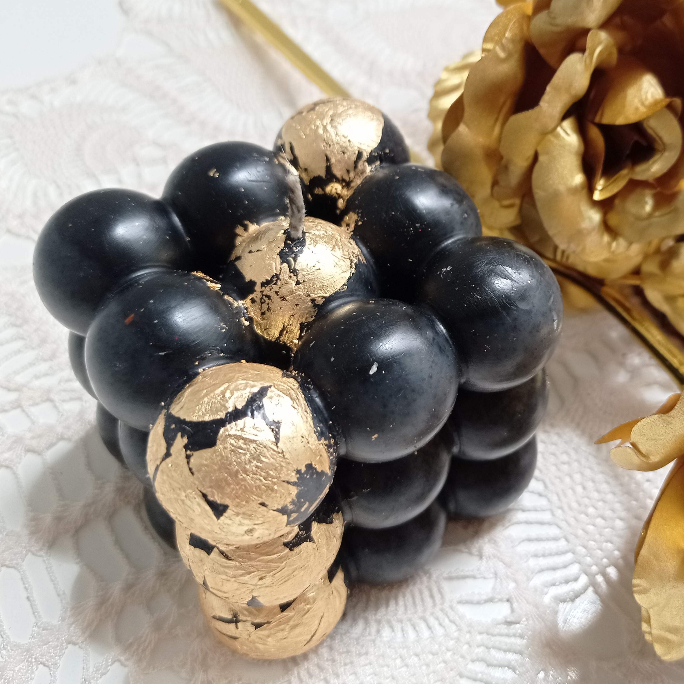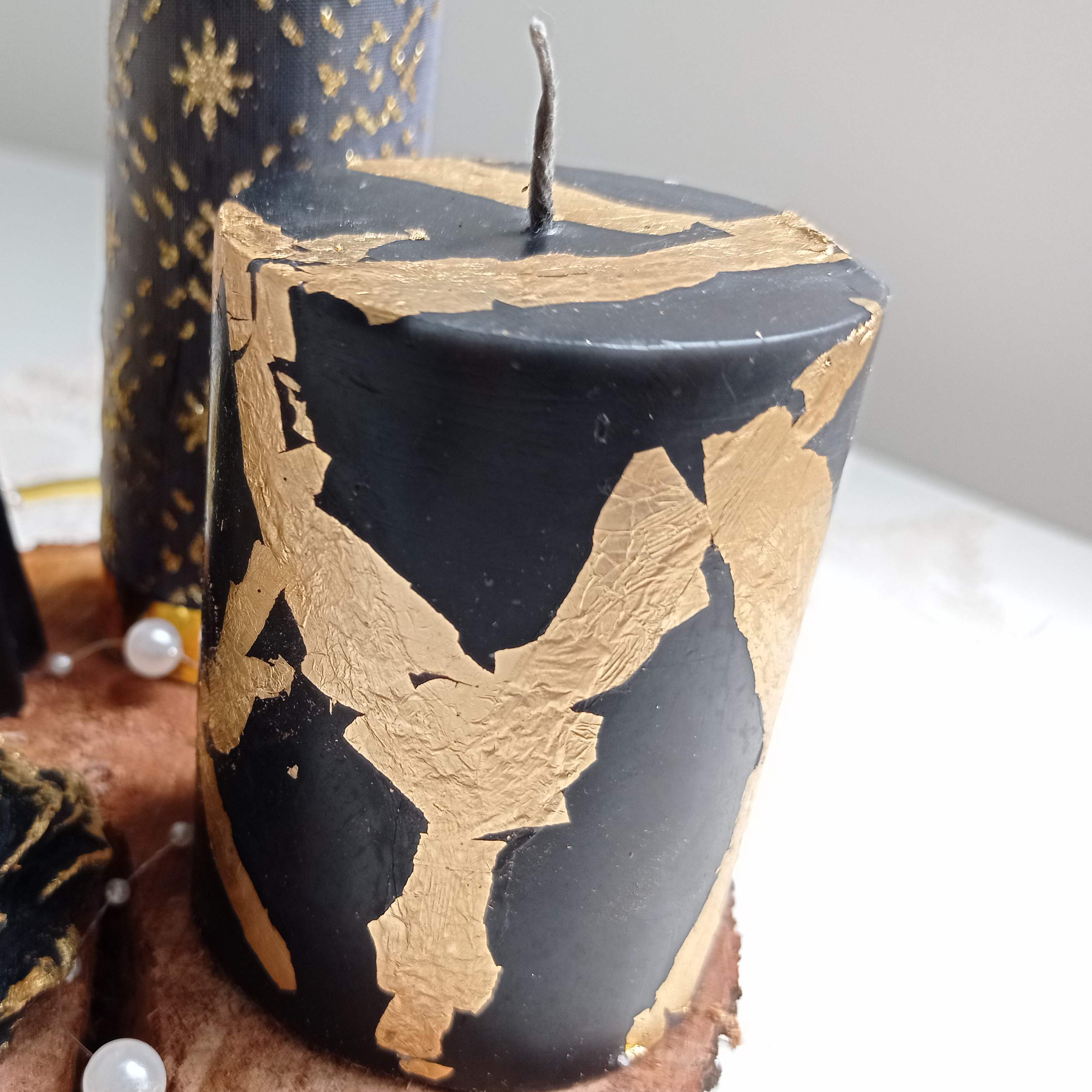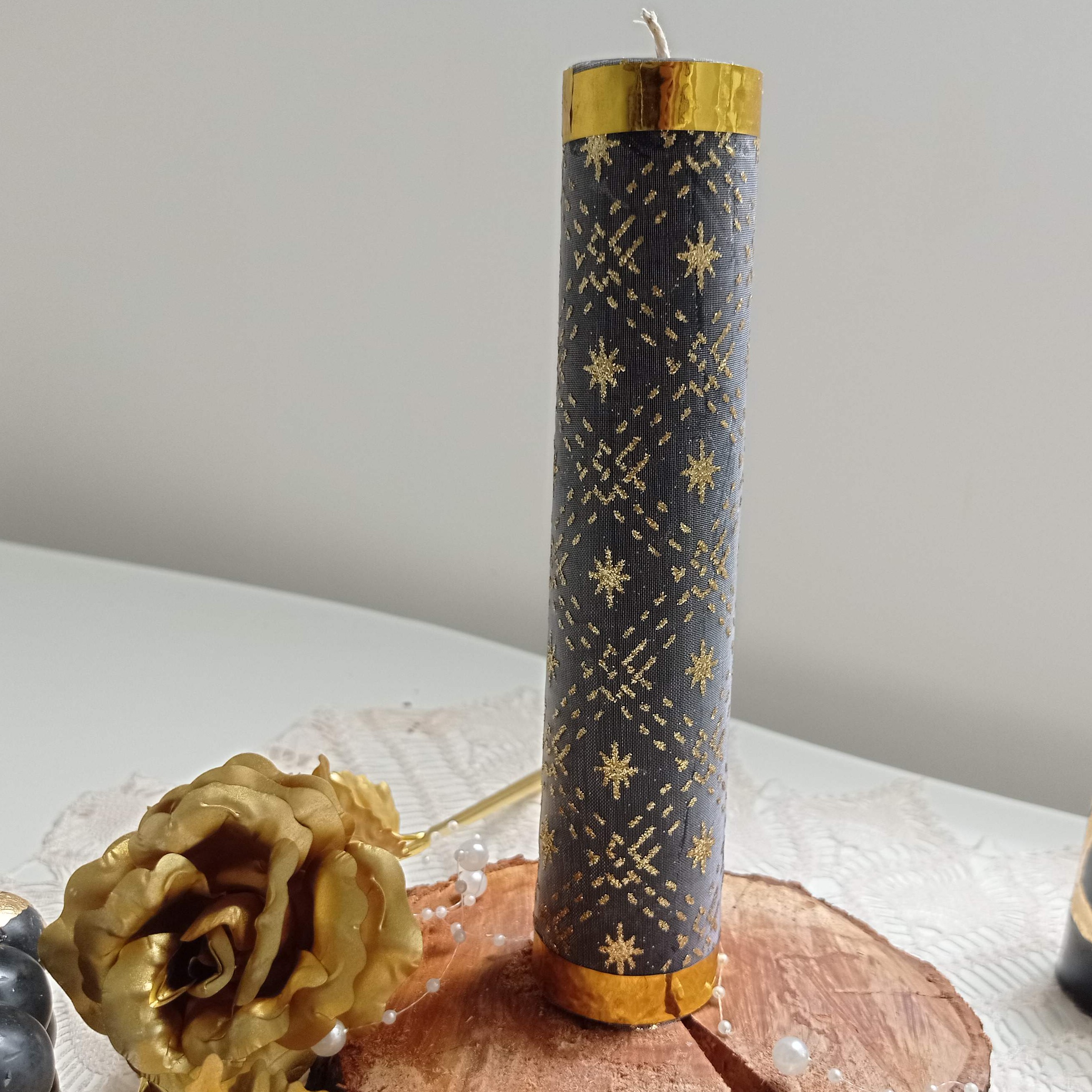 ست شمع مشکی5عددی با تزیین ورق طلا و توری طلا کوب شامل آلاله دوعدد استوانه ای شمع روبیک و هرمی ستاره ای