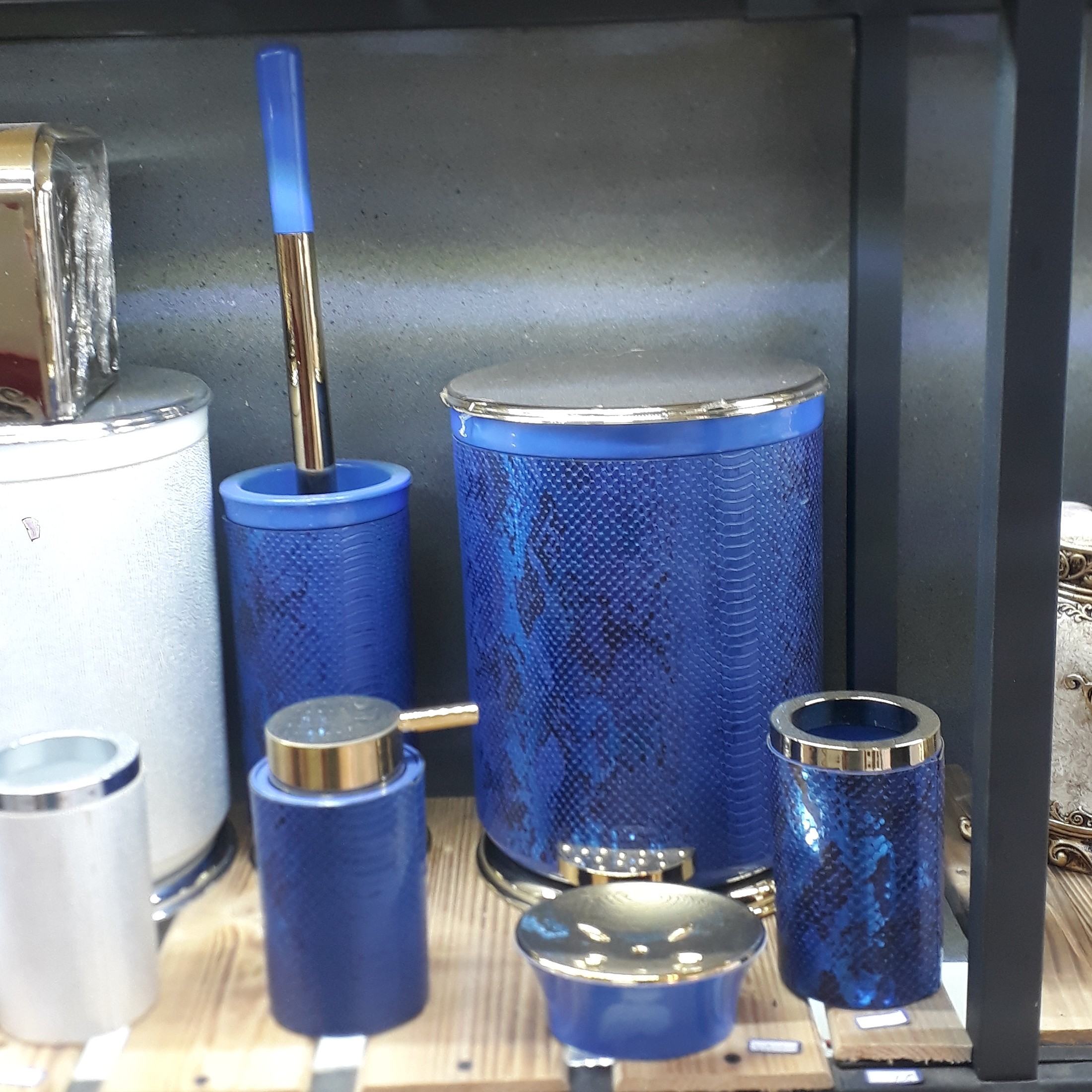 ست شامل سطل و فرچه ، جامایع و جاصابون و جامسواک . جنس محصول چرم می باشد . بسیار لوکس و لاکچری .