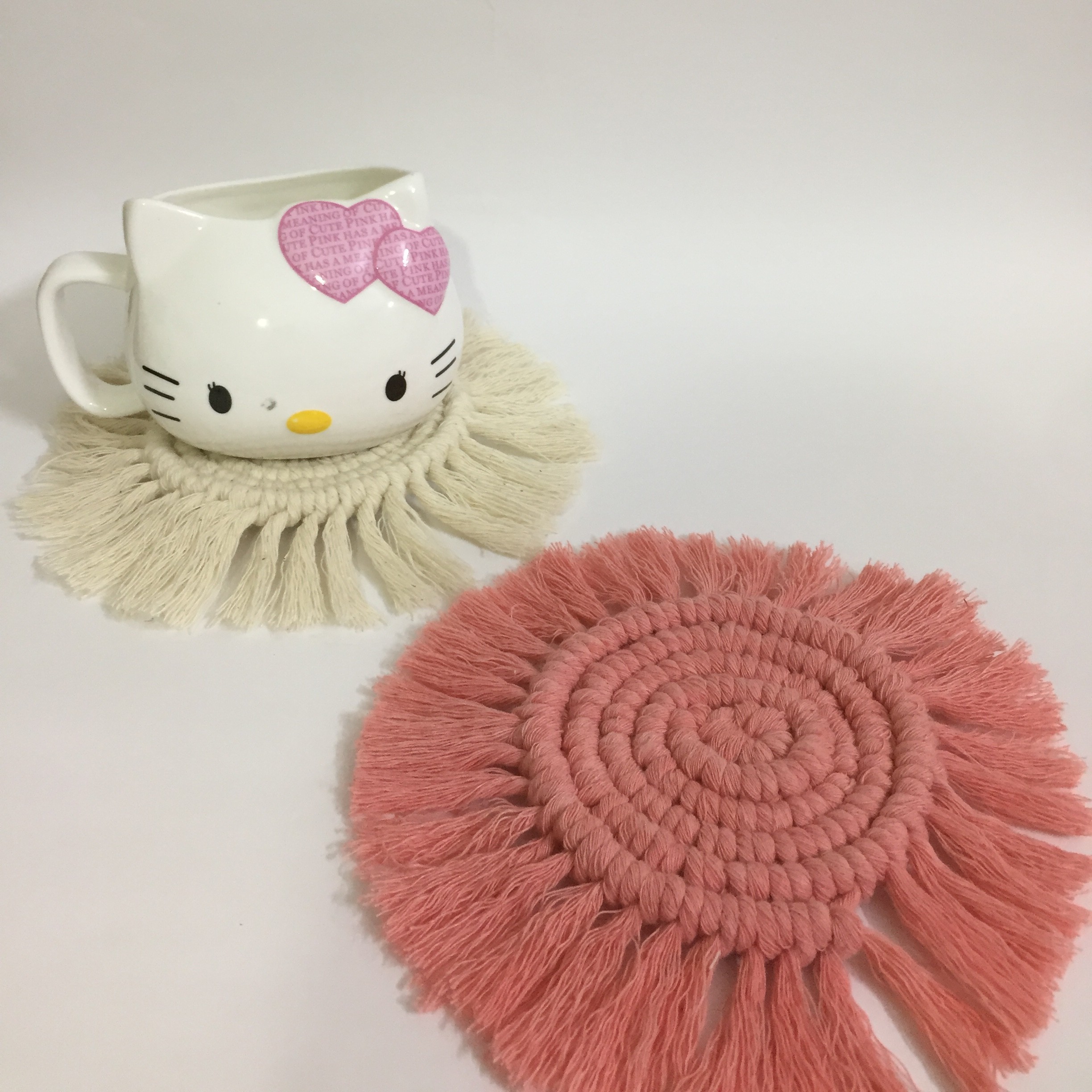 زیرلیوانی مکرومه قطر با ریشه تقریبا ۱۵ سانت قابل سفارش در رنگ های مختلف