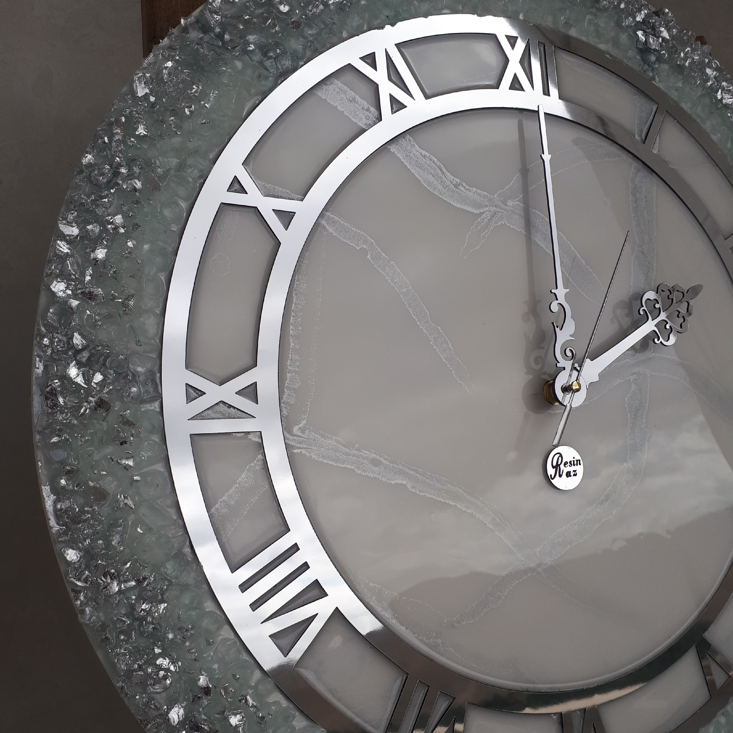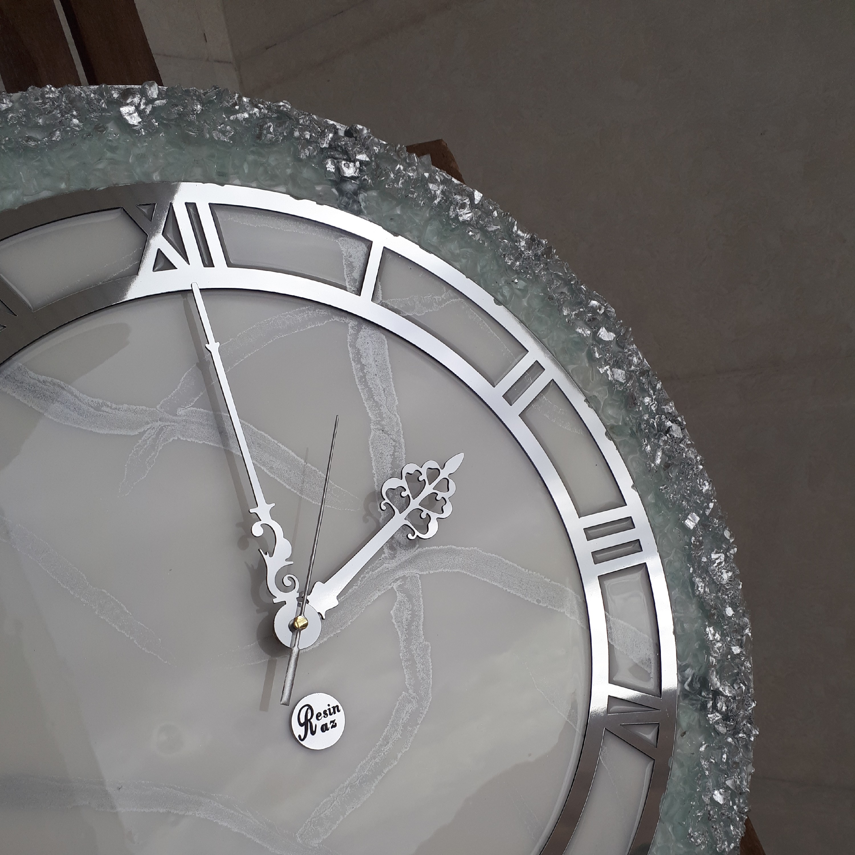 ساعت دیواری رزینی طرح سپید نقره ای قطر 60 کار شده با کریستال و ورق نقره مبلمونسرا مدل 240227