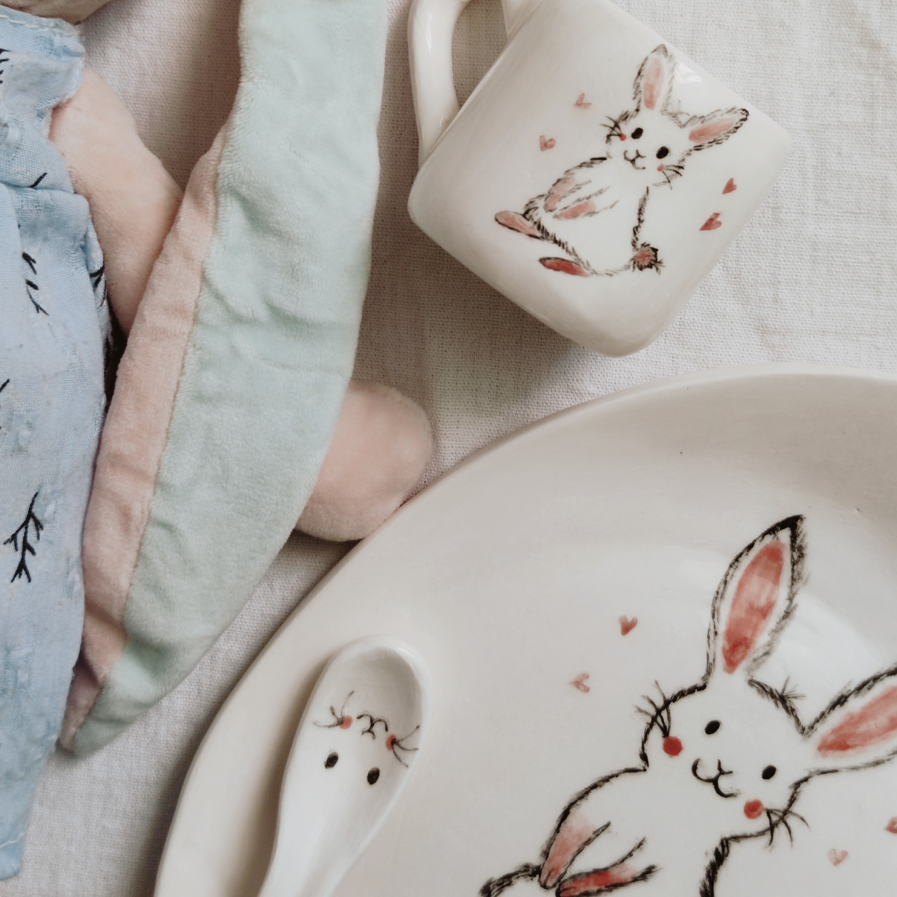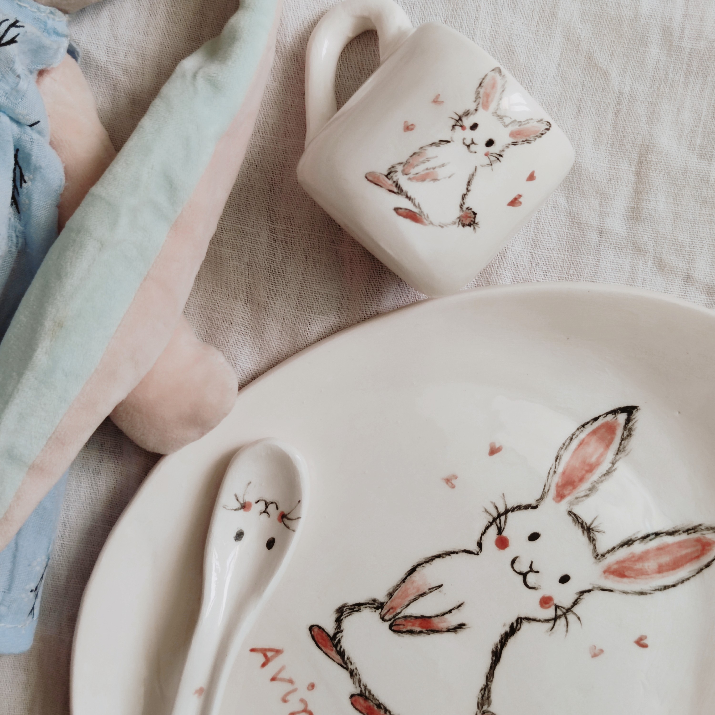 سرویس سرامیکی دستساز کودک قابل سفارش در رنگ .. طرح و اندازه های مختلف..شامل بشقاب لیوان و قاشق
