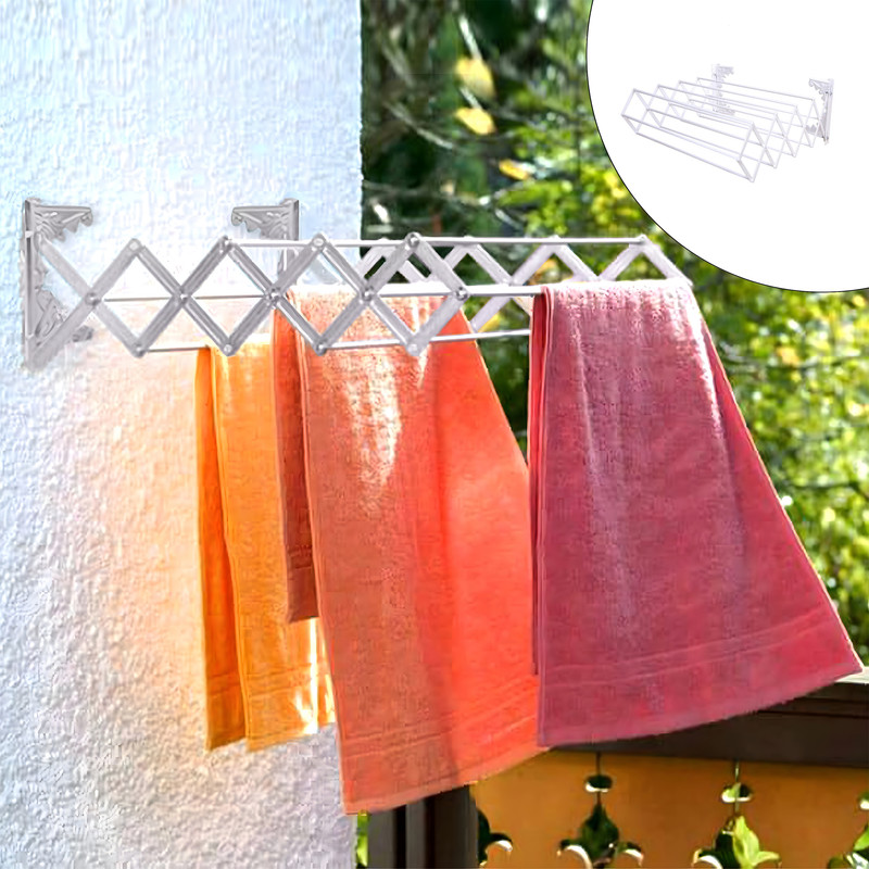 13 ردیف پهن نمودن لباس -هرردیف 60 از جنس اهن محکم وپوشش رنگ الکترو که در کوره حرارت می بیند و مقاومت بالا دارد نوع سفید یخچالی - 13x60=حدودا 7مترو نیم طول جهت پهن نمودن لباس در کوچکترین تراس -دو نگهدارننده در کنار که حالت جمع شو رخت اویز را نگهداری می کند - ابعاد که به دیوار نصب شده 62x30و جمع شو 10 سانتیمتر - کلیه اتصالات توسط پیچ و مهره می باشد و نقاط ثابت با جوش کاری CO2 - حاشیه و کادر رخت اویز با 4 عدد لچکی می باشد