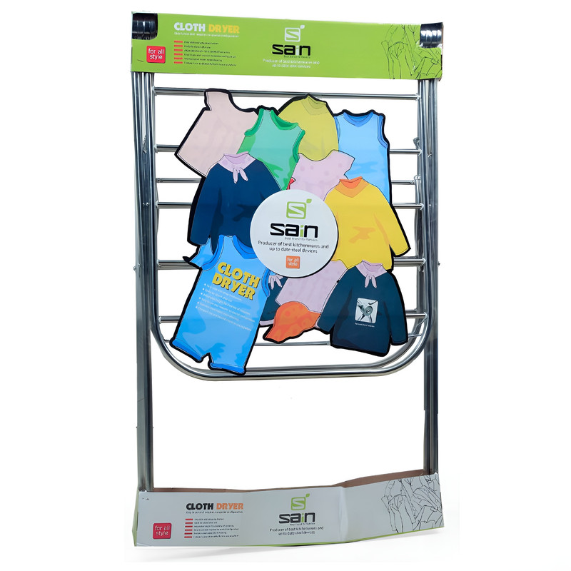 تمامی قسمت ها به غیر از اتصالات این بند رخت از استیل ضد زنگ می باشد بنابراین میتوان از این بند رخت در هر شرایط آب و هوایی استفاده نمود . این بند رخت در قسمت فوقانی تجهیزشده با 10 میله و در قسمت زیرین دارای 3 میله برای آویز لباسهاست.این بند رخت دارای حالت های تاشو متفاوتی می باشد.