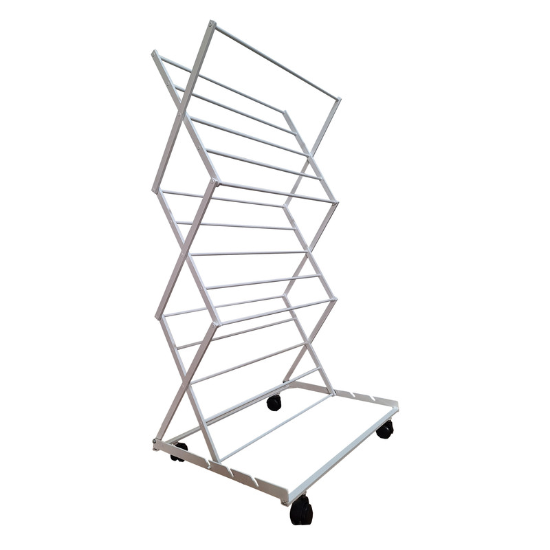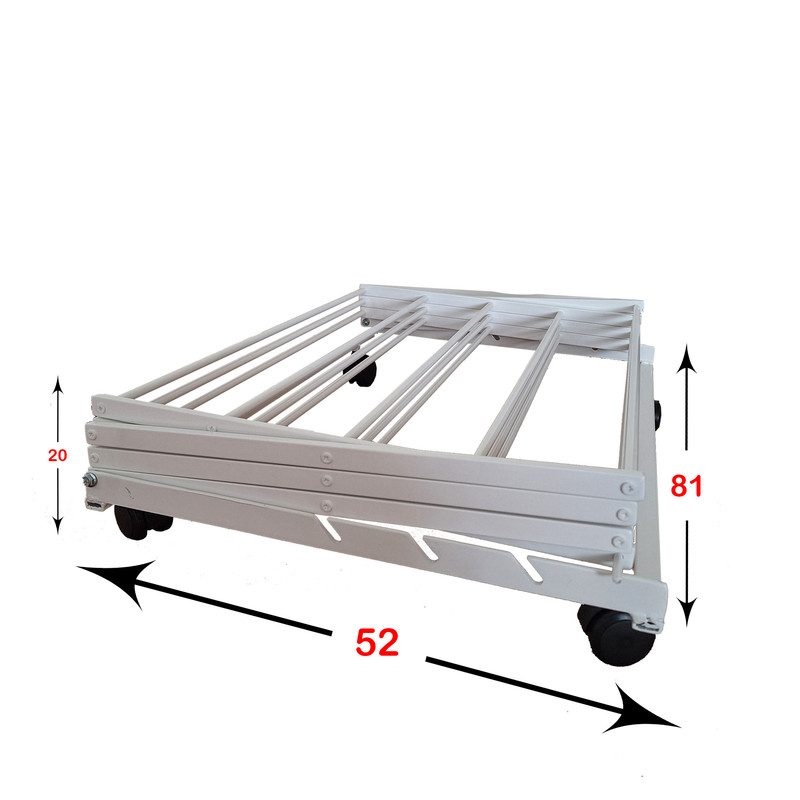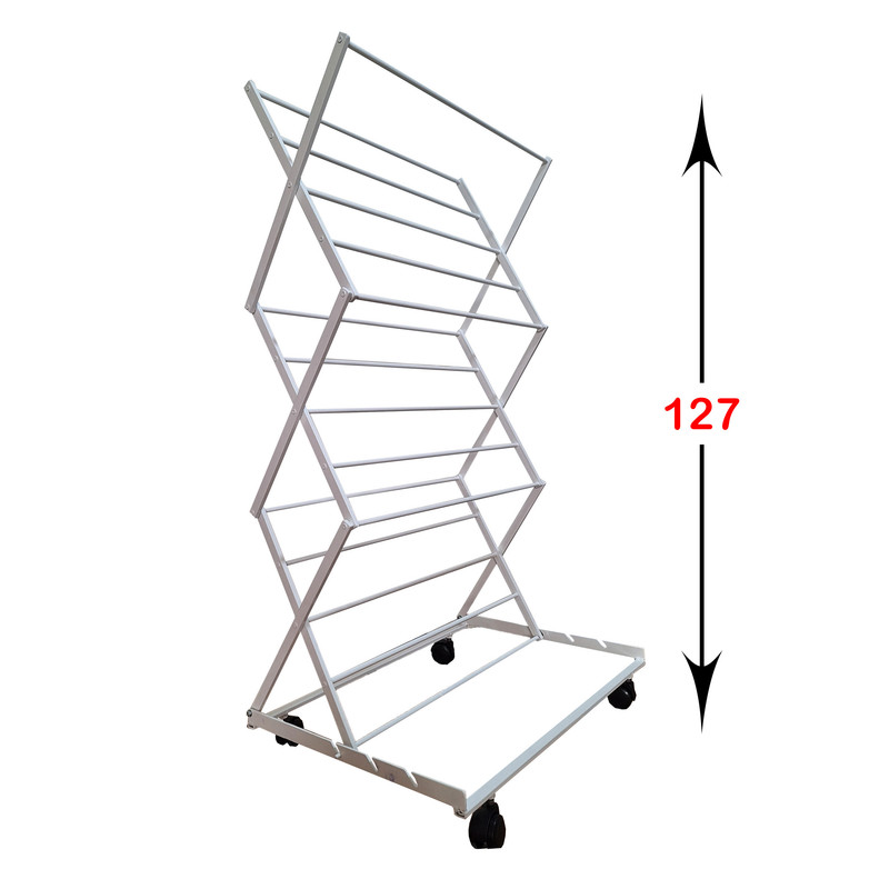15ردیف پهن نمودن لباس و هرردیف 70 سانتیمتر از جنس آهن محکم و مقاوم پو شش رنگ ا حرارت کوره نوع سفید یخچالی چهار چرخ در زیر جهت جابجایی به نقاط مختلف ساختمان بدون نیاز به برداشتن لباسها .درزمان غیر استفاده می توان جمع نمود و دریک فضای یا محل کوچک و حتی زیر تخت نگهداری کنیم .نقاط ثابت توسط جوش co2 متصل شده و محلهای متحرک توسط پیچ و رولپلاک وصل شده .دارای 3 حالت ارتفاع قابل تنظیم 127 سانتیمتر .107 سانتیمتر .71سانتیمتر و نهایتا جمع شو . قابل استفاده بدون محدودیت سنی