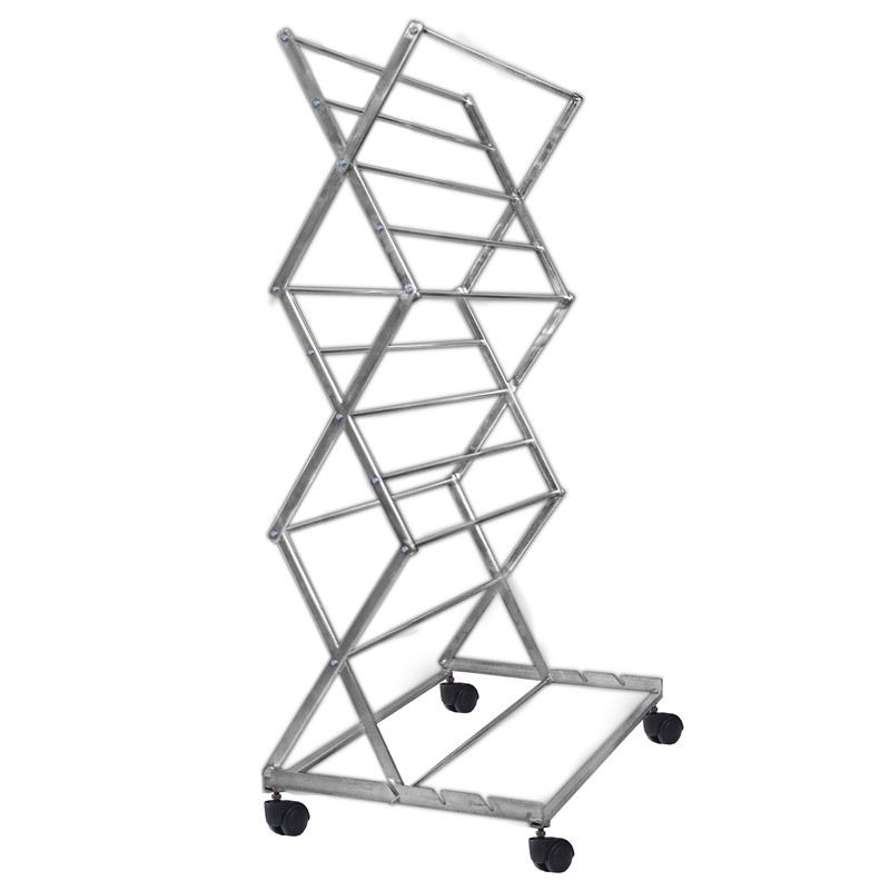 ازجنس آهن محکم ،طرح استیل یا آبکاری نیکل کروم ، 13 ردیف پهن نمودن لباس و هرردیف 70 سانتیمتر ، چهار چرخ در زیر جهت جابجایی با لباس ویا بدون لباس ،بعداز استفاده باتوجه به مکانیزم آکاردئونی جمع شده ودر یک کنار ویا زیر تخت نگهداری می شود ،نقاط اتصال متحرک توسط پیچ و مهره و اتصالات ثابت با جوش co2 متصل گردیده ،