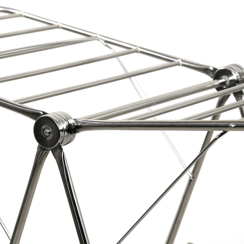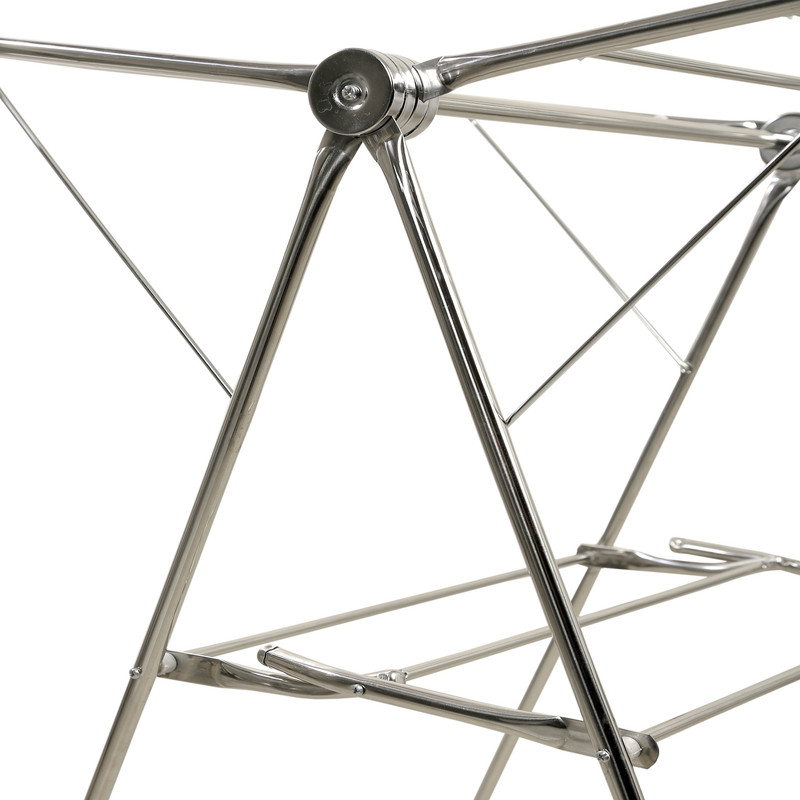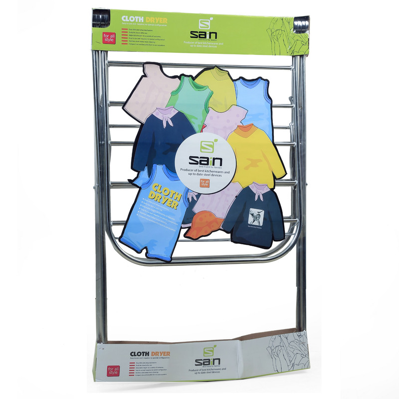 تمامی قسمت ها به غیر از اتصالات این بند رخت از استیل ضد زنگ می باشد بنابراین میتوان از این بند رخت در هر شرایط آب و هوایی استفاده نمود . این بند رخت در قسمت فوقانی تجهیزشده با 10 میله و در قسمت زیرین دارای 3 میله برای آویز لباسهاست.این بند رخت دارای حالت های تاشو متفاوتی می باشد.