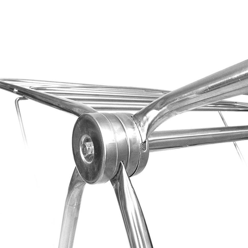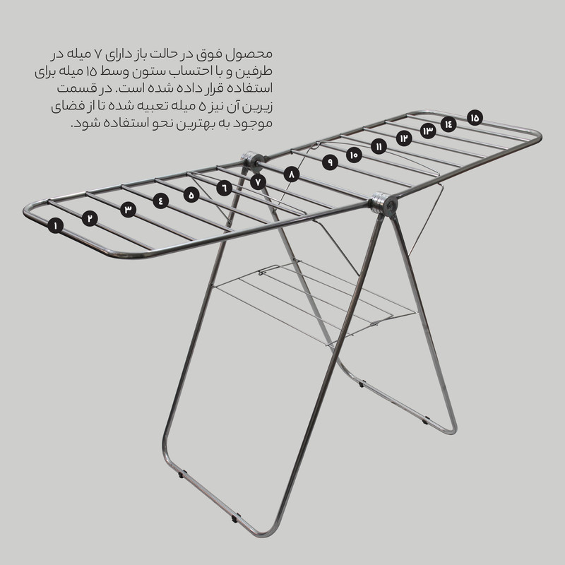 محصول فوق در حالت باز دارای ۷ میله در طرفین و با احتساب ستون وسط ۱۵ میله برای استفاده قرار داده شده است. در قسمت زیرین آن نیز ۵ میله تعبیه شده است. ابعاد محصول در حالت باز ۱۴۴ x ۹۰ x ۵۷ سانتی متر است. این محصول از جنس فلز با رنگ استیل استاتیک ضد زنگ زدگی و ضد خش است.