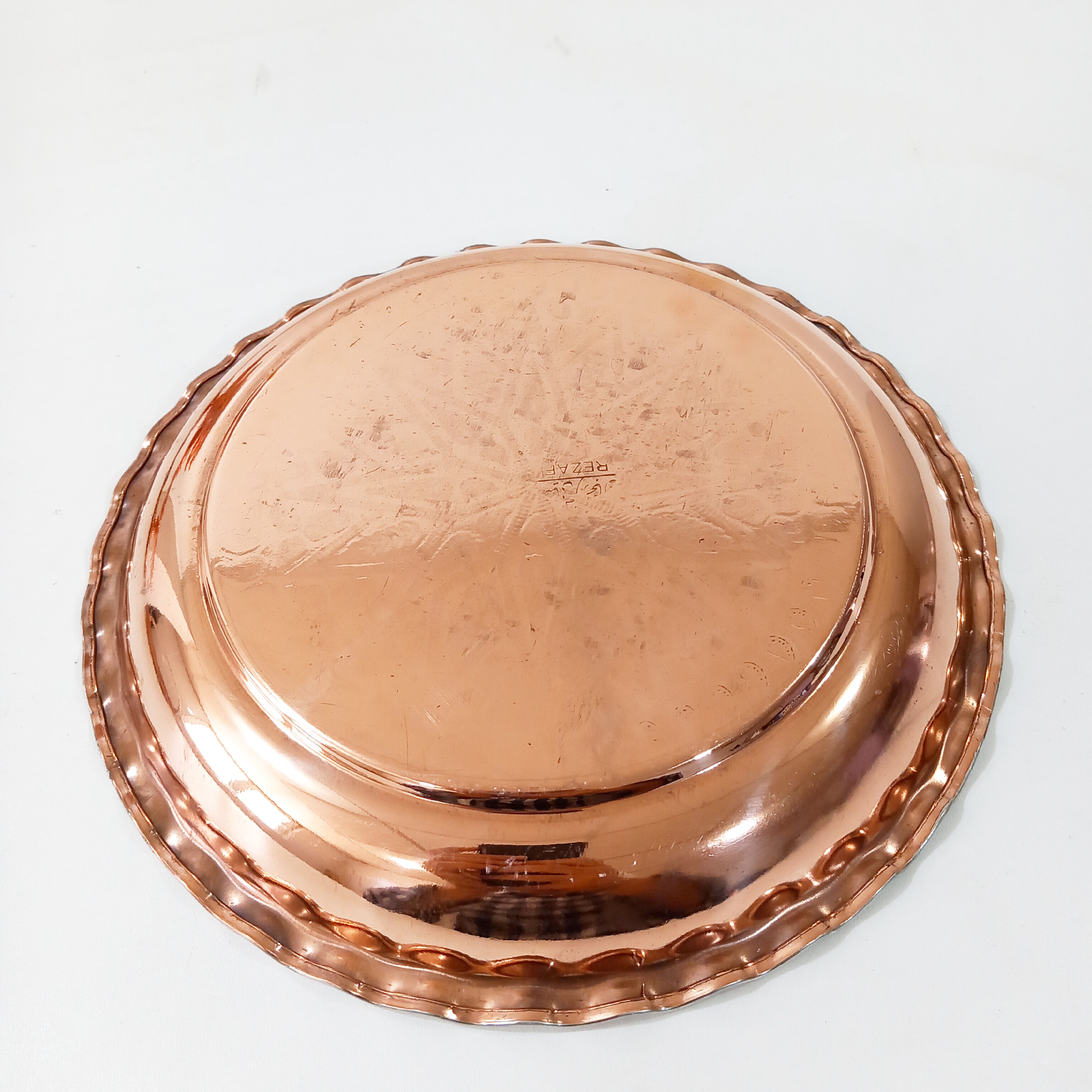 دیس پلو یا سالاد خوری تمام مس زنجان ضخیم و درجه یک قطر ۲۱ که سایز بندی کامل این محصول موجود است داخل ظرف طرح دار و قلع شده است